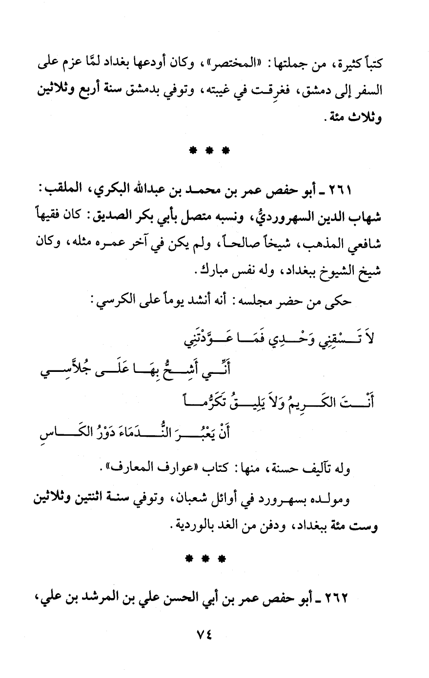 261 - أبو حفص عمر بن محمد بن عبد الله البكري، الملقب: شهاب الدين السهرورديُّ، ونسبه متصل بأبي بكر الصديق: كان فقيهًا شافعي المذهب، شيخًا صالحًا، ولم يكن في آخر عمره مثله، وكان شيخ الشيوخ ببغداد، وله نفس مبارك.