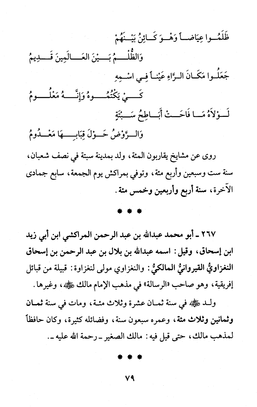 267 - أبو محمد عبد الله بن عبد الرحمن المراكشي ابن أبي زيد ابن إسحاق، وقيل: اسمه عبد الله بن بلال بن عبد الرحمن بن إسحاق النغزاويُّ القيروانيُّ المالكيُّ: والنغزاوي مولى لنغزاوة: قبيلة من قبائل إفريقية، وهو صاحب "الرسالة" في مذهب الإمام مالك - رضي الله عنه -، وغيرها.