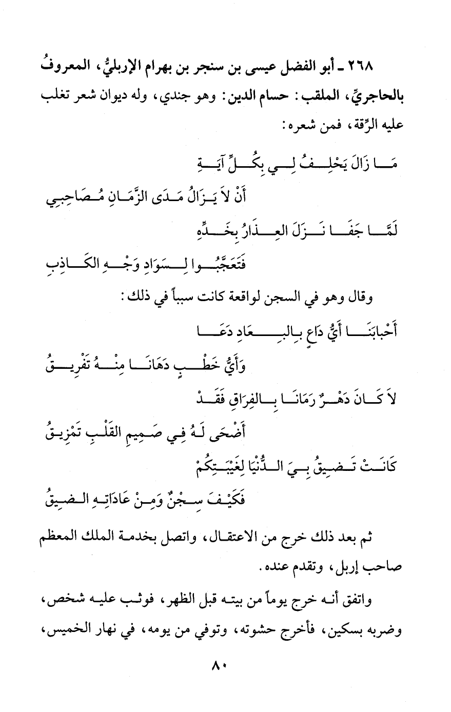 268 - أبو الفضل عيسى بن سنجر بن بهرام الإربليُّ، المعروفُ بالحاجريِّ، الملقب: حسام الدين: وهو جندي، وله ديوان شعر تغلب عليه الرِّقة، فمن شعره:
