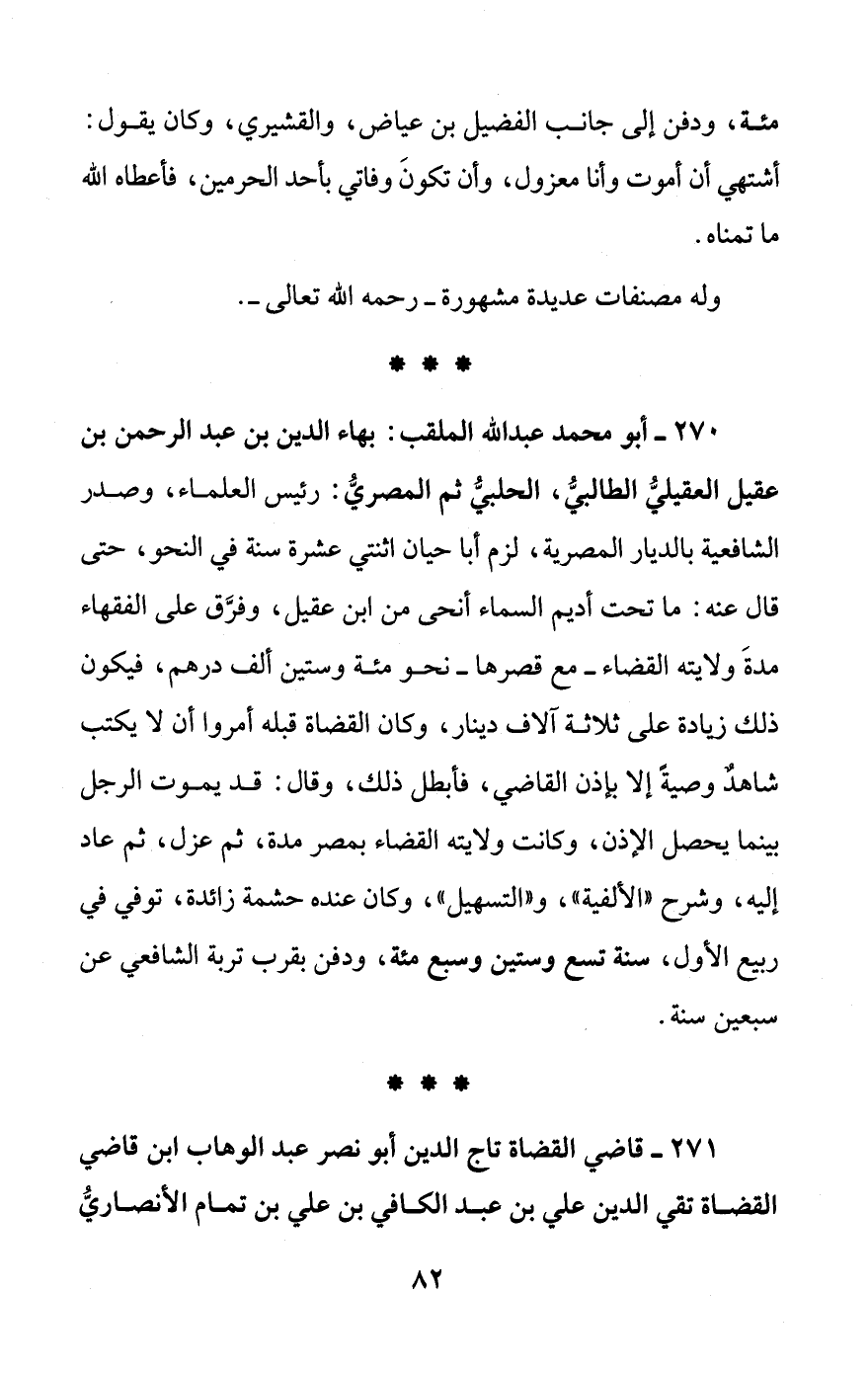 270 - أبو محمد عبد الله الملقب: بهاء الدين بن عبد الرحمن بن عقيل العقيليُّ الطالبيُّ، الحلبيُّ ثم المصريُّ: رئيس العلماء، وصدر الشافعية بالديار المصرية، لزم أبا حيان اثنتي عشرة سنة في النحو، حتى قال عنه: ما تحت أديم السماء أنحى من ابن عقيل، وفرَّق على الفقهاء مدةَ ولايته القضاء - مع قصرها - نحو مئة وستين ألف درهم، فيكون ذلك زيادة على ثلاثة آلاف دينار، وكان القضاة قبله أمروا أن لا يكتب شاهدٌ وصيةً إلا بإذن القاضي، فأبطل ذلك، وقال: قد يموت الرجل بينما يحصل الإذن، وكانت ولايته القضاء بمصر مدة، ثم عزل، ثم عاد إليه، وشرح "الألفية"، و"التسهيل"، وكان عنده حشمة زائدة، توفي في ربيع الأول، سنة تسع وستين وسبع مئة، ودفن بقرب تربة الشافعي عن سبعين سنة.