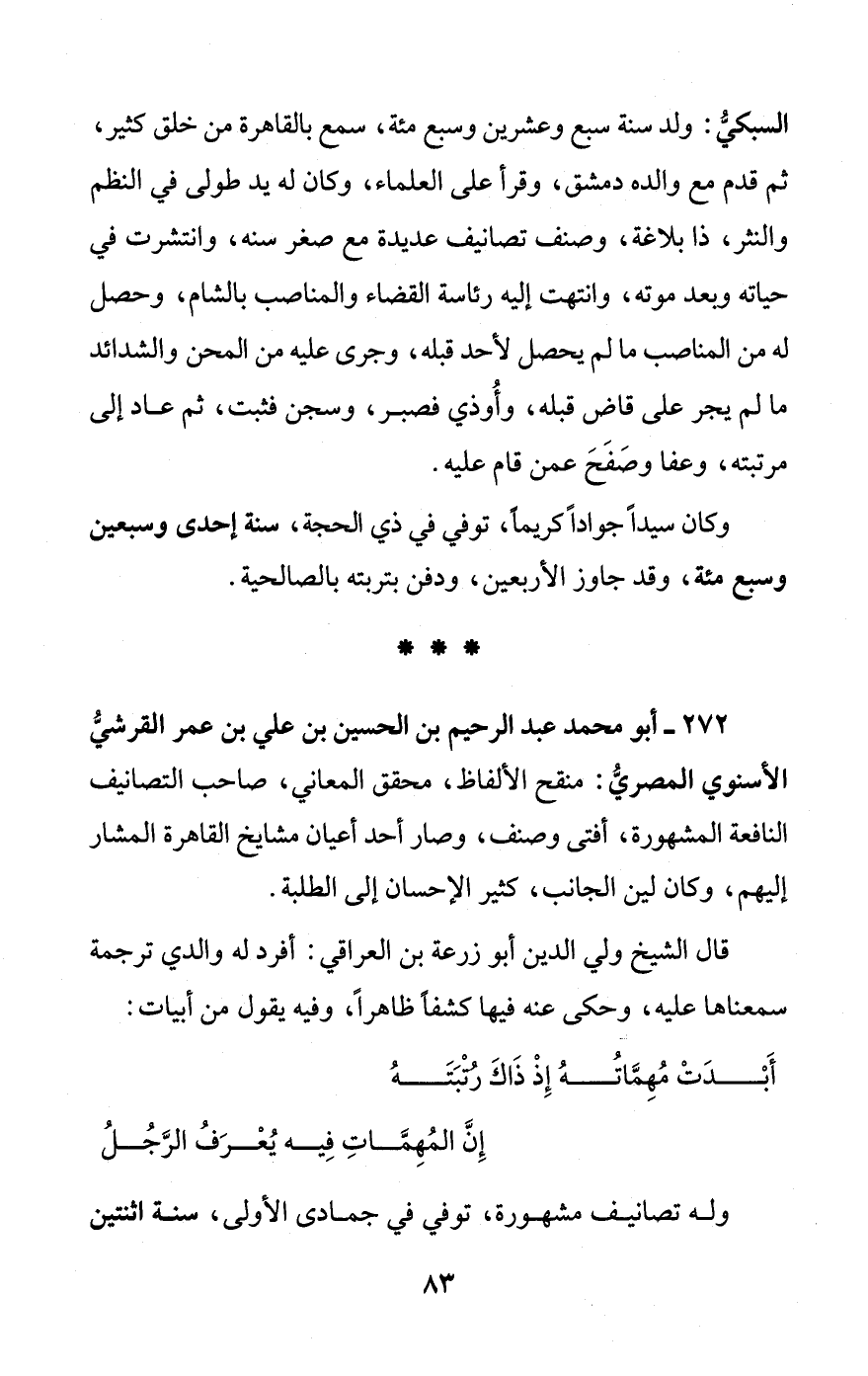 272 - أبو محمد عبد الرحيم بن الحسين بن علي بن عمر القرشيُّ الأسنوي المصريُّ: منقح الألفاظ، محقق المعاني، صاحب التصانيف النافعة المشهورة، أفتى وصنف، وصار أحد أعيان مشايخ القاهرة المشار إليهم، وكان لين الجانب، كثير الإحسان إلى الطلبة.