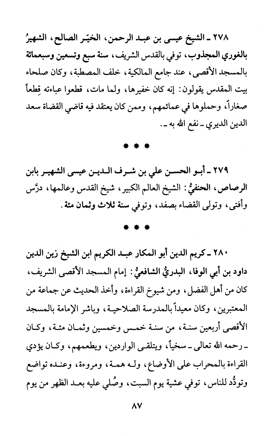 278 - الشيخ عيسى بن عبد الرحمن، الخيّر الصالح، الشهيرُ بالغوري المجذوب، توفي بالقدس الشريف، سنة سبع وتسعين وسبعمائة بالمسجد الأقصى، عند جامع المالكية، خلف المصطبة، وكان صلحاء بيت المقدس يقولون: إنه كان خفيرها، ولما مات، قطعوا عباءته قِطعًا صغارًا، وحملوها في عمائمهم، وممن كان يعتقد فيه قاضي القضاة سعد الدين الديري - نفع الله به -.