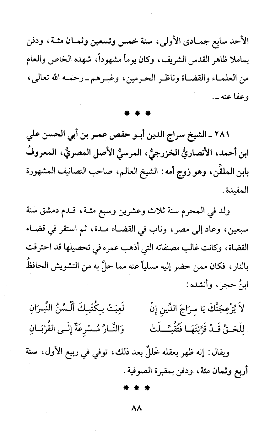 281 - الشيخ سراج الدين أبو حفص عمر بن أبي الحسن علي ابن أحمد، الأنصاريُّ الخزرجيُّ، المرسيُّ الأصل المصريُّ، المعروفُ بابن الملقِّن، وهو زوج أمه: الشيخ العالم، صاحب التصانيف المشهورة المفيدة.