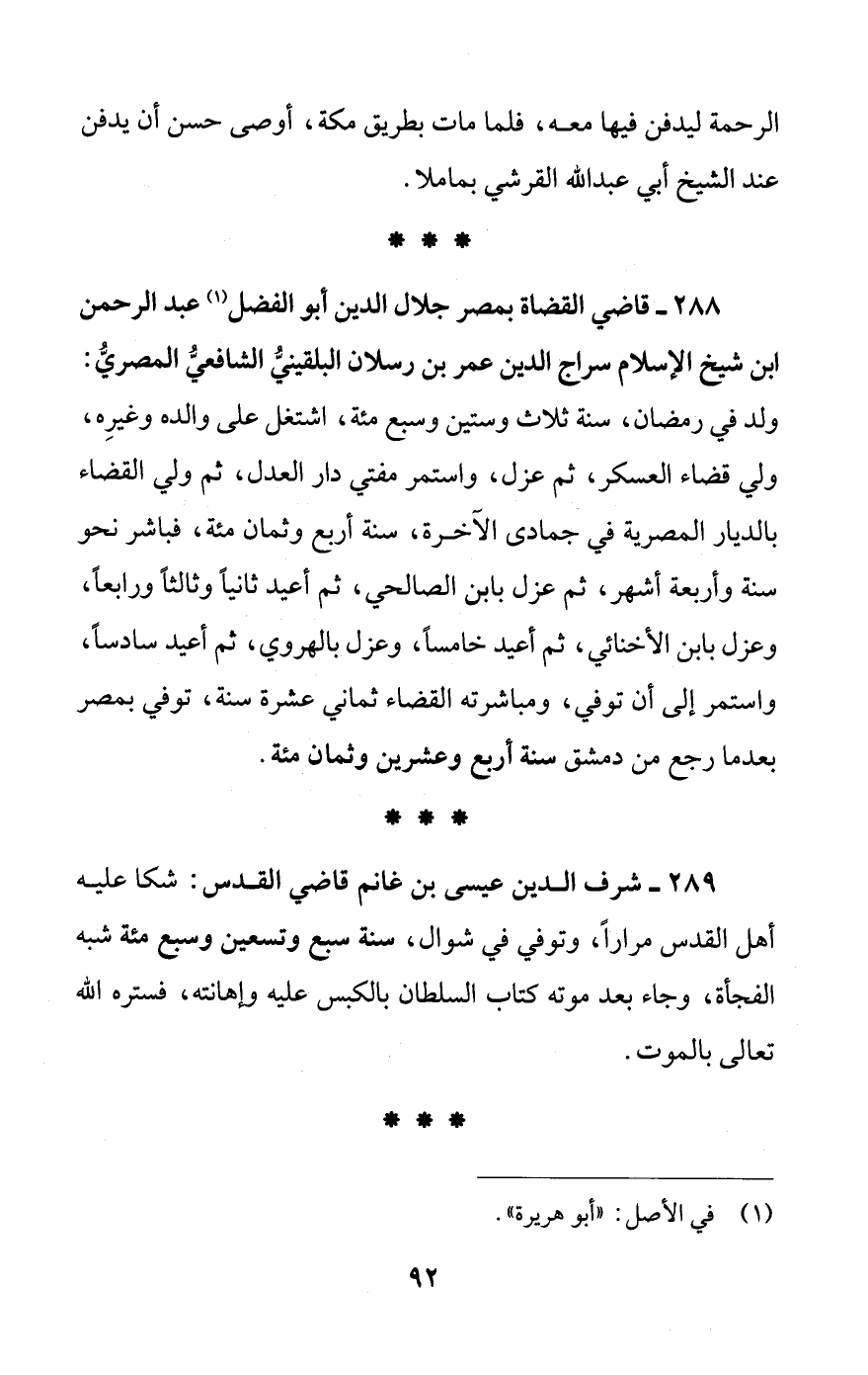 288 - قاضي القضاة بمصر جلال الدين أبو الفضل (¬1) عبد الرحمن ابن شيخ الإسلام سراج الدين عمر بن رسلان البلقينيُّ الشافعيُّ المصريُّ: ولد في رمضان، سنة ثلاث وستين وسبع مئة، اشتغل على والده وغيرِه، ولي قضاء العسكر، ثم عزل، واستمر مفتي دار العدل، ثم ولي القضاء بالديار المصرية في جمادى الآخرة، سنة أربع وثمان مئة، فباشر نحو سنة وأربعة أشهر، ثم عزل بابن الصالحي، ثم أعيد ثانيًا وثالثًا ورابعًا، وعزل بابن الأخنائي، ثم أعيد خامسًا، وعزل بالهروي، ثم أعيد سادسًا، واستمر إلى أن توفي، ومباشرته القضاء ثماني عشرة سنة، توفي بمصر بعد ما رجع من دمشق سنة أربع وعشرين وثمان مئة.