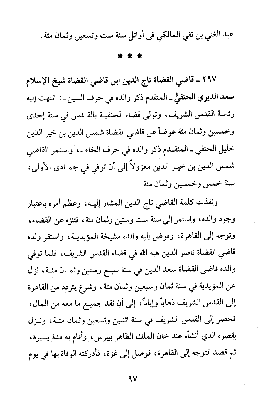 297 - قاضي القضاة تاج الدين ابن قاضي القضاة شيخ الإسلام سعد الديري الحنفيُّ - المتقدم ذكر والده في حرف السين -: انتهت إليه رئاسة القدس الشريف، وتولى قضاء الحنفية بالقدس في سنة إحدى وخمسين وثمان مئة عوضًا عن قاضي القضاة شمس الدين بن خير الدين خليل الحنفي - المتقدم ذكر والده في حرف الخاء -، واستمر القاضي شمس الدين بن خير الدين معزولًا إلى أن توفي في جمادى الأولى، سنة خمس وخمسين وثمان مئة.