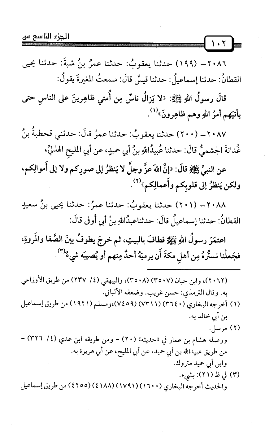 2086- (199) حدثنا يعقوبُ: حدثنا عمرُ بنُ شبةَ: حدثنا يحيى القطانُ: حدثنا إسماعيلُ: حدثنا قيسٌ قالَ: سمعتُ المغيرةَ يقولُ: