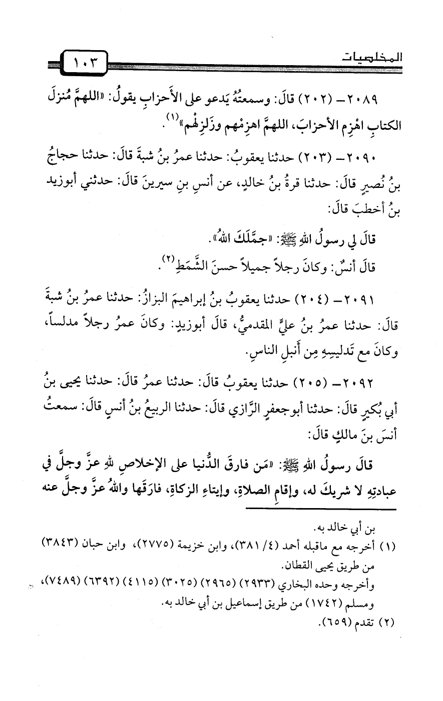 2090- (203) حدثنا يعقوبُ: حدثنا عمرُ بنُ شبةَ قالَ: حدثنا حجاجُ بنُ نُصيرٍ قالَ: حدثنا قرةُ بنُ خالدٍ، عن أنسِ بنِ سيرينَ قالَ: حدثني أبوزيد بنُ أخطبَ قالَ: