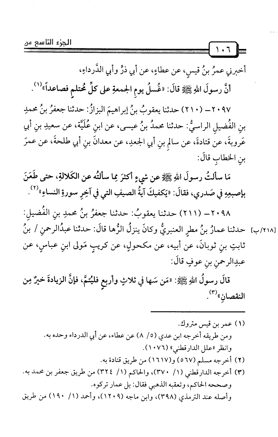 2098- (211) حدثنا يعقوبُ: حدثنا جعفرُ بنُ محمدِ بنِ الفُضيلِ: حدثنا عمارُ بنُ مطرٍ العنبريُّ وكانَ ينزلُ الرُّها قالَ: حدثنا عبدُالرحمنِ / بنُ ثابتِ بنِ ثوبانَ، عن أبيه، عن مكحولٍ، عن كريبٍ مَولى ابنِ عباسٍ، عن عبدِالرحمنِ بنِ عوفٍ قالَ: