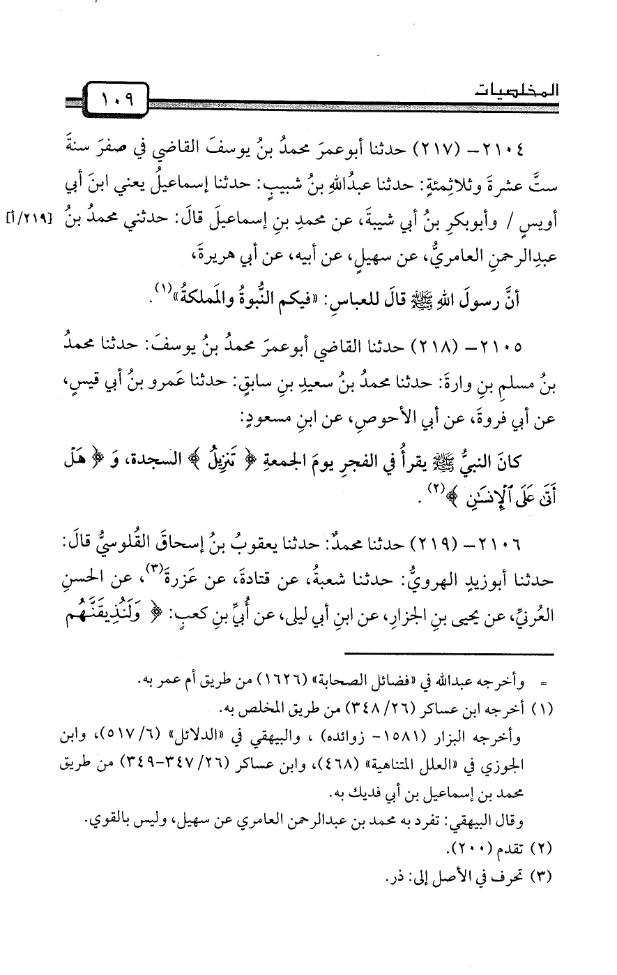 2105- (218) حدثنا القاضي أبوعمرَ محمدُ بنُ يوسفَ: حدثنا محمدُ بنُ مسلمِ بنِ وارةَ: حدثنا محمدُ بنُ سعيدِ بنِ سابقٍ: حدثنا عَمرو بنُ أبي قيسٍ، عن أبي فروةَ، عن أبي الأحوصِ، عن ابنِ مسعودٍ: