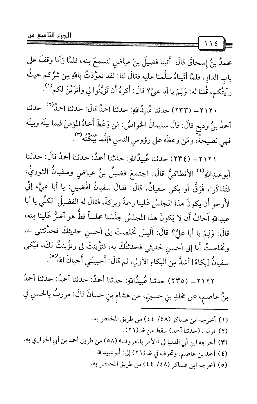 2121- (234) حدثنا عُبيدُاللهِ: حدثنا أحمدُ: حدثنا أحمدُ قالَ: حدثنا أبوعبدِاللهِ (¬4) الأنطاكيُّ قالَ: اجتمعَ فضيلُ بنُ عياضٍ وسفيانُ الثوريُّ، فتَذاكَرا، فَرَقَّ أو بكى سفيانُ، قالَ: فقالَ سفيانُ لفُضيلٍ: يا أبا عليٍّ، إنِّي لأَرجو أَن يكونَ هذا المجلسُ عَلينا رحمةً وبركةً، فقالَ له الفضيلُ: لكنِّي يا أبا عبدِاللهِ أَخافُ أَن لا يَكونَ هذا المجلسُ جلَسْنا مجلساً قطُّ هو أضرُّ عَلينا مِنه، قالَ: وَلِمَ يا أبا عليٍّ؟ قالَ: أَليسَ تَخلصتَ إلى أحسنِ حديثِكَ فحدَّثتني به، وتَخلصتُ أَنا إلى أحسنِ حَديثي فحدثتُكَ به، فتزَّينتَ لي وتزَّينتُ لكَ، فبَكى سفيانُ [بكاءً] أشدَّ مِن البكاءِ الأولِ، ثم قالَ: أَحييتَني أَحياكَ اللهُ (¬5) .