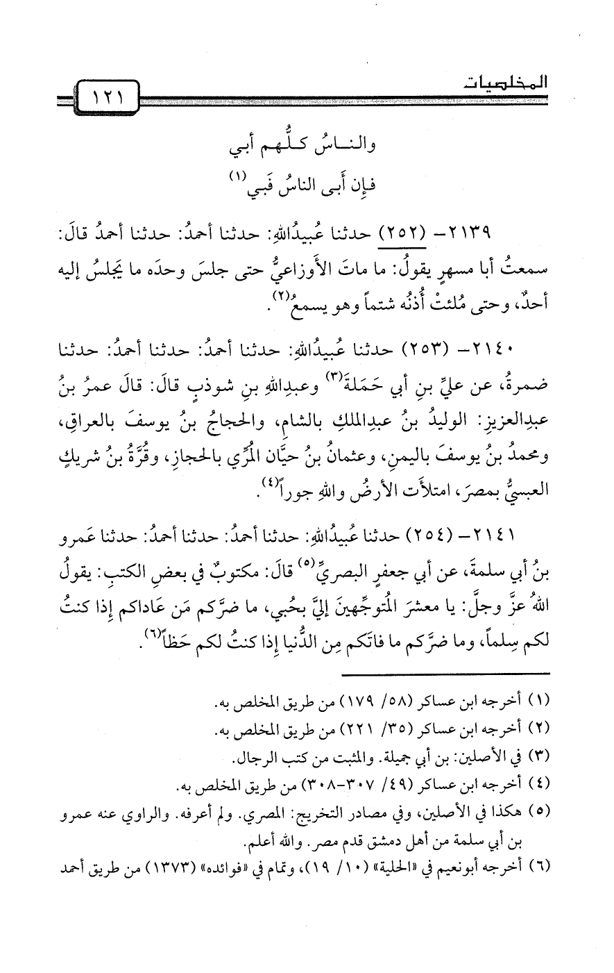 2139- (252) حدثنا عُبيدُاللهِ: حدثنا أحمدُ: حدثنا أحمدُ قالَ: سمعتُ أبا مسهرٍ يقولُ: ما ماتَ الأَوزاعيُّ حتى جلسَ وحدَه ما يَجلسُ إليه أحدٌ، وحتى مُلئتْ أُذنُه شتماً وهو يسمعُ (¬2) .