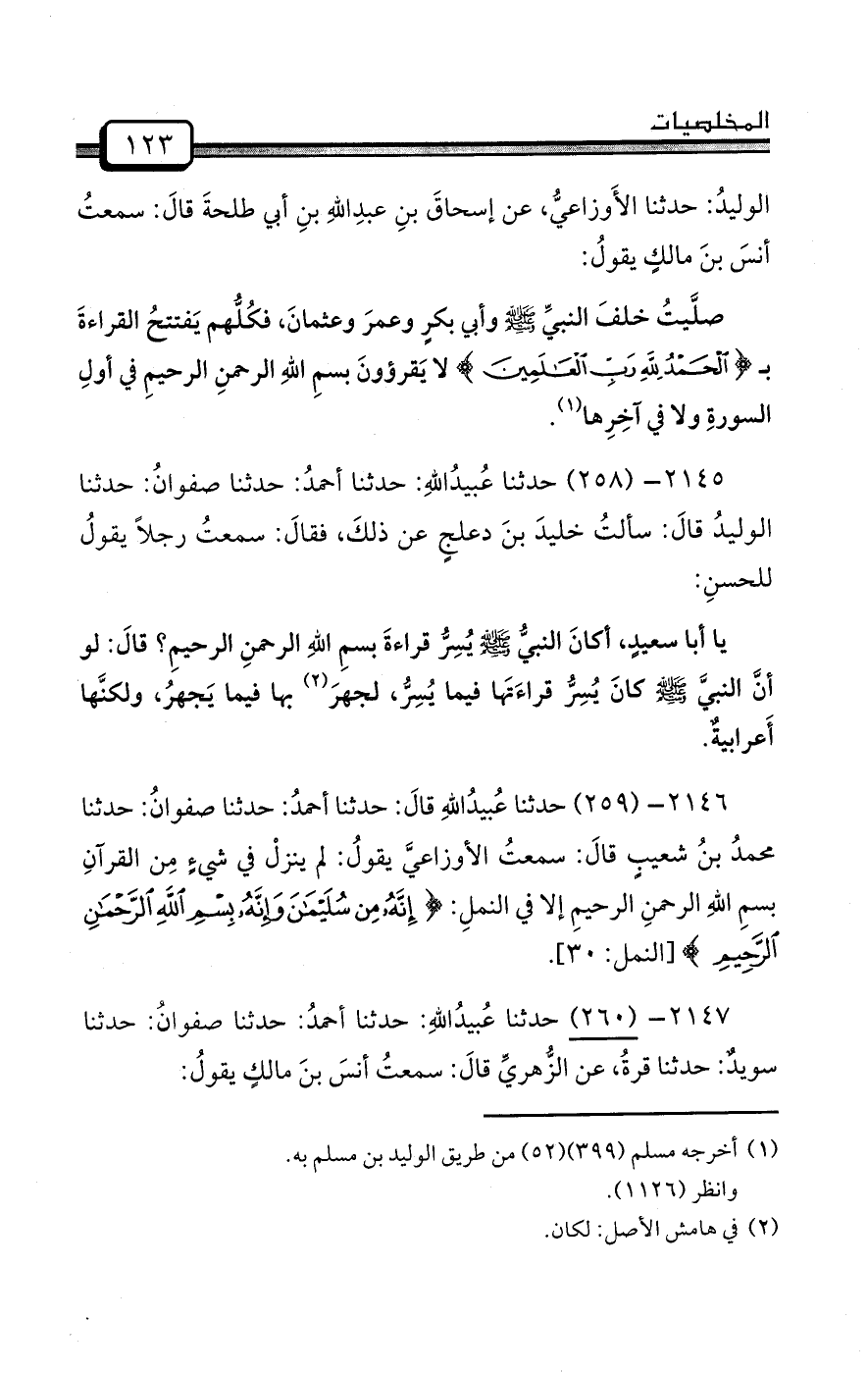 صلَّيتُ خلفَ النبيِّ صلى الله عليه وسلم وأبي بكرٍ وعمرَ وعثمانَ، فكُلُّهم يَفتتحُ القراءةَ بـ {الْحَمْدُ للهِ رَبِّ الْعَالَمِين} لا يَقرؤونَ بسمِ اللهِ الرحمنِ الرحيمِ في أولِ السورةِ ولا في آخِرِها (¬1) .
