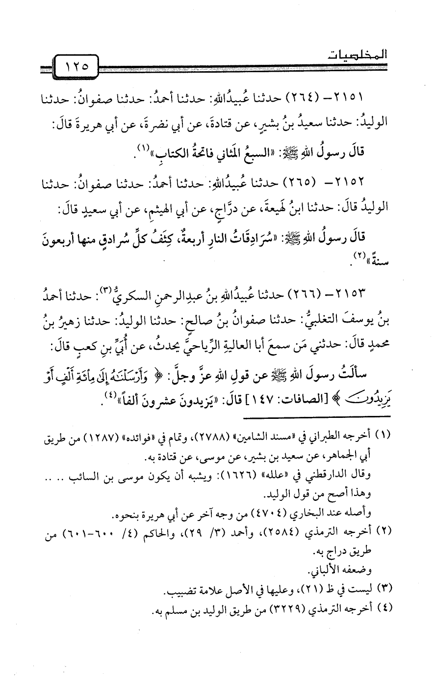 2151- (264) حدثنا عُبيدُاللهِ: حدثنا أحمدُ: حدثنا صفوانُ: حدثنا الوليدُ: حدثنا سعيدُ بنُ بشيرٍ، عن قتادةَ، عن أبي نضرةَ، عن أبي هريرةَ قالَ: