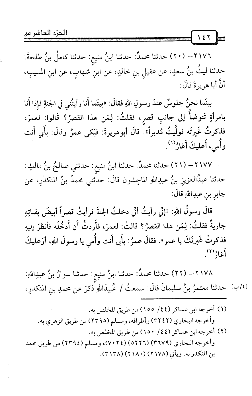 2177- (21) حدثنا محمدٌ: حدثنا ابنُ منيعٍ: حدثني صالحُ بنُ مالكٍ: حدثنا عبدُالعزيزِ بنُ عبدِاللهِ الماجِشون قالَ: حدثني محمدُ بنُ المنكدرِ، عن جابرِ بنِ عبدِاللهِ قالَ: