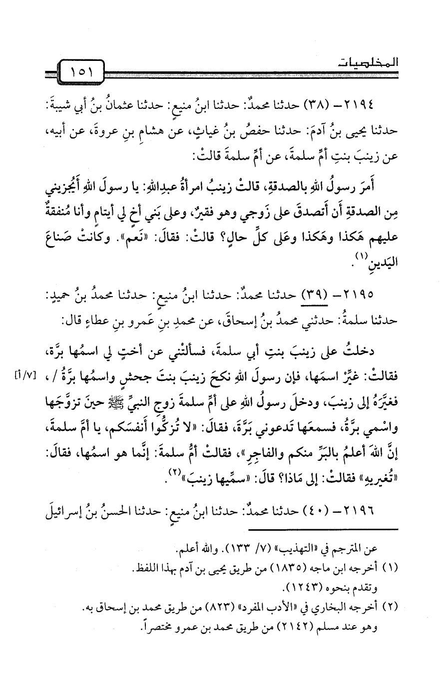 2194- (38) حدثنا محمدٌ: حدثنا ابنُ منيعٍ: حدثنا عثمانُ بنُ أبي شيبةَ: حدثنا يحيى بنُ آدمَ: حدثنا حفصُ بنُ غياثٍ، عن هشامِ بنِ عروةَ، عن أبيه، عن زينبَ بنتِ أمِّ سلمةَ، عن أمِّ سلمةَ قالتْ: