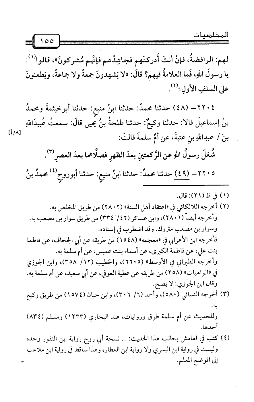 2204- (48) حدثنا محمدٌ: حدثنا ابنُ منيعٍ: حدثنا أبوخيثمةَ ومحمدُ بنُ إسماعيلَ قالا: حدثنا وكيعٌ: حدثنا طلحةُ بنُ يحيى قالَ: سمعتُ عُبيدَاللهِ بنَ / عبدِاللهِ بنِ عتبةَ، عن أمِّ سلمةَ قالتْ: