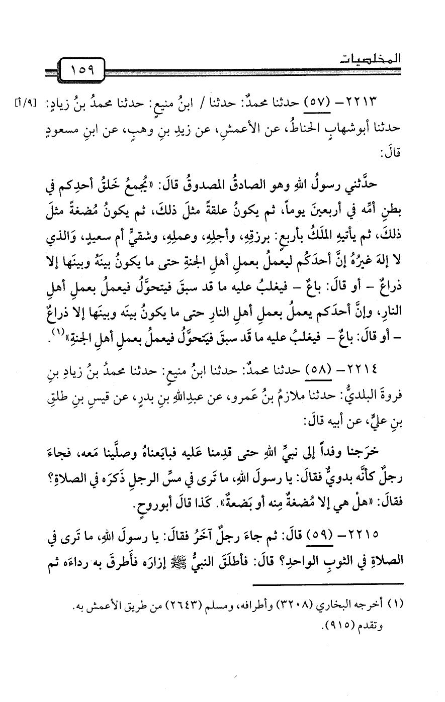 2213- (57) حدثنا محمدٌ: حدثنا / ابنُ منيعٍ: حدثنا محمدُ بنُ زيادٍ: حدثنا أبوشهابٍ الحناطُ، عن الأعمشِ، عن زيدِ بنِ وهبٍ، عن ابنِ مسعودٍ قالَ: