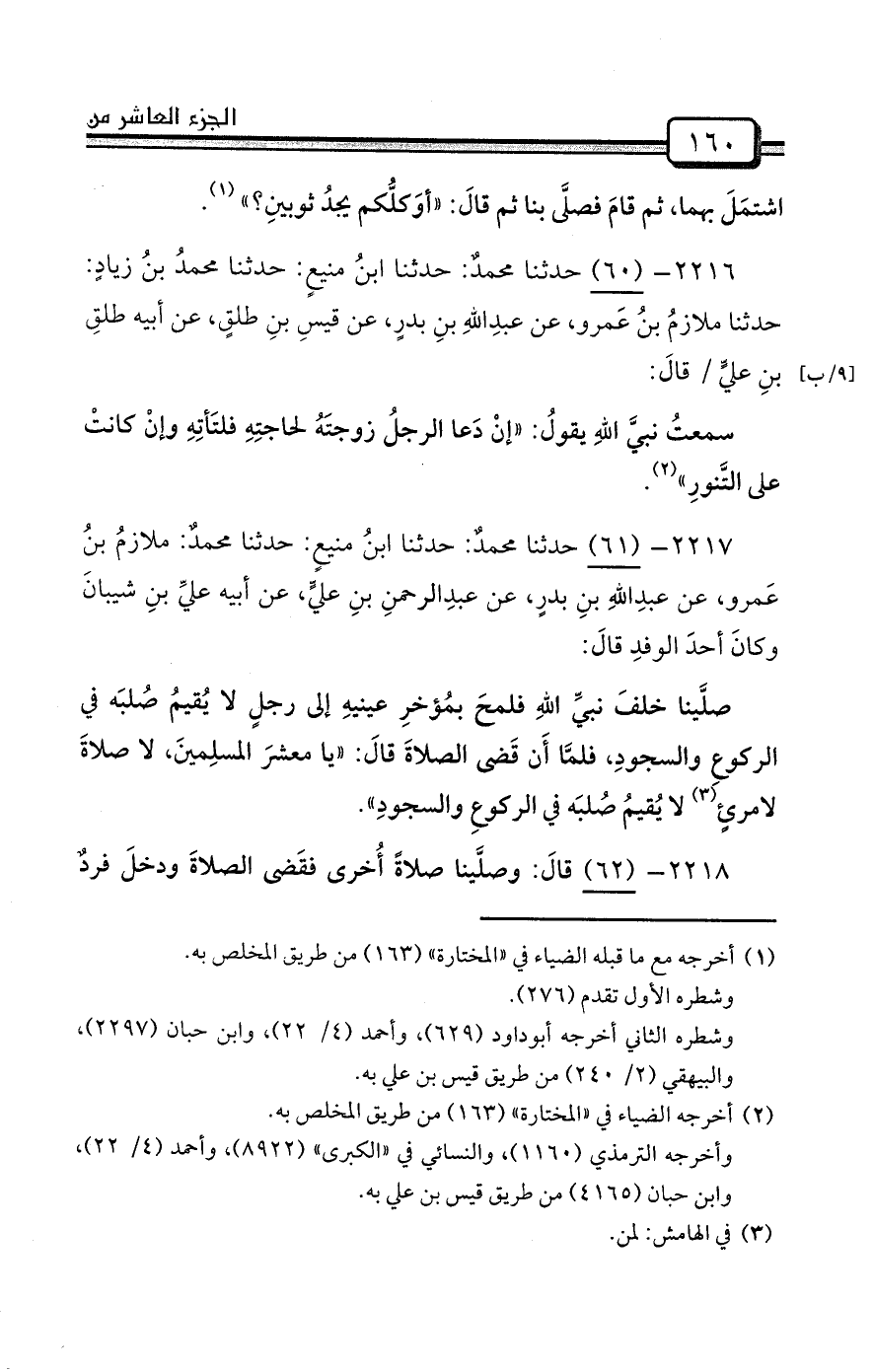 2216- (60) حدثنا محمدٌ: حدثنا ابنُ منيعٍ: حدثنا محمدُ بنُ زيادٍ: حدثنا ملازمُ بنُ عَمرو، عن عبدِاللهِ بنِ بدرٍ، عن قيسِ بنِ طلقٍ، عن أبيه طلقِ بنِ عليٍّ / قالَ: