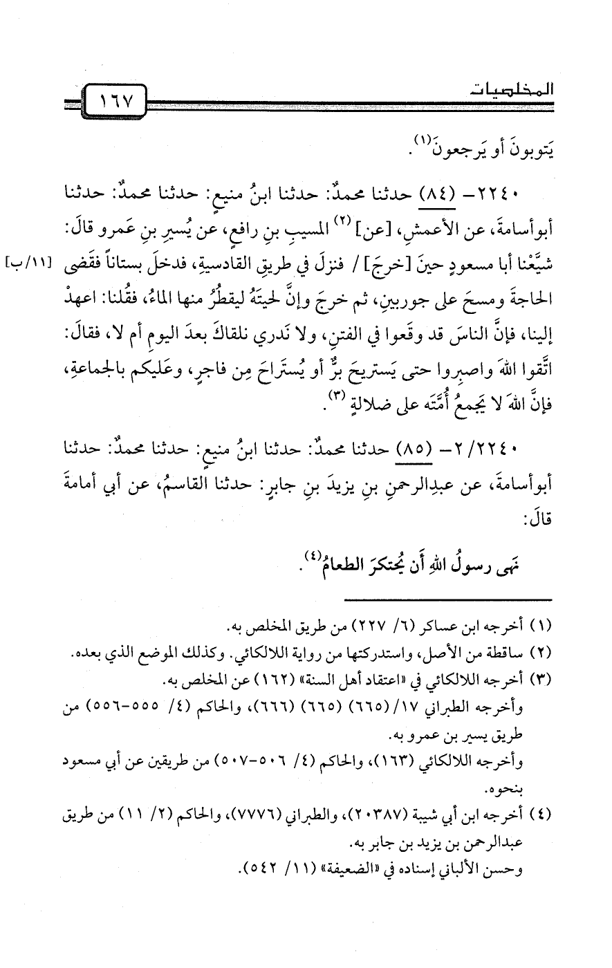 2240/2- (85) حدثنا محمدٌ: حدثنا ابنُ منيعٍ: حدثنا محمدٌ: حدثنا أبوأسامةَ، عن عبدِالرحمنِ بنِ يزيدَ بنِ جابرٍ: حدثنا القاسمُ، عن أبي أمامةَ قالَ: