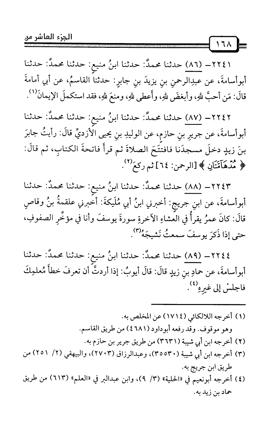2241- (86) حدثنا محمدٌ: حدثنا ابنُ منيعٍ: حدثنا محمدٌ: حدثنا أبوأسامةَ، عن عبدِالرحمنِ بنِ يزيدَ بنِ جابرٍ: حدثنا القاسمُ، عن أبي أمامةَ قالَ: مَن أحبَّ للهِ، وأبغضَ للهِ، وأَعطى للهِ، ومنعَ للهِ، فقد استكملَ الإيمانَ (¬1) .