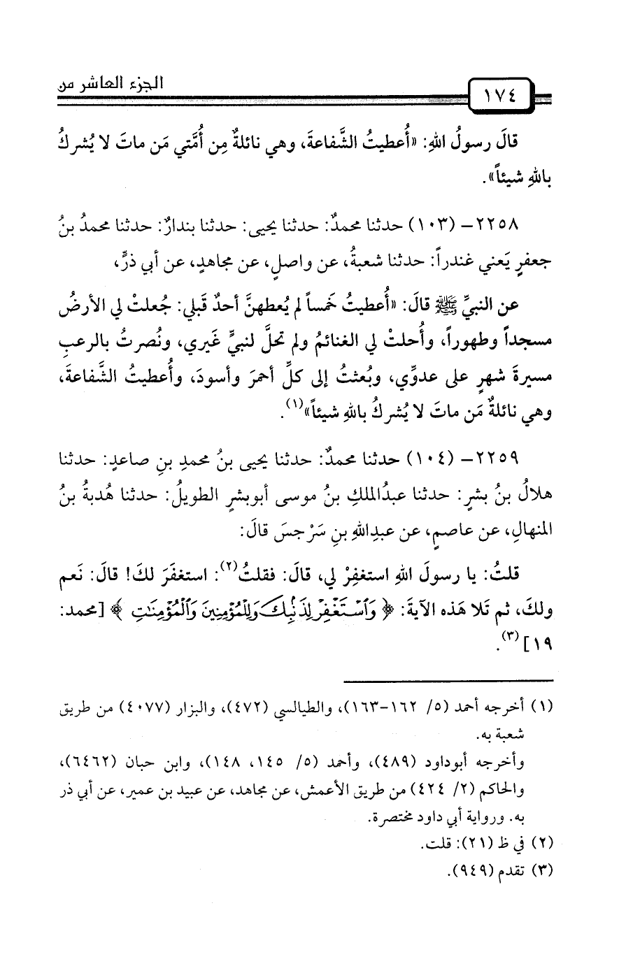 2259- (104) حدثنا محمدٌ: حدثنا يحيى بنُ محمدِ بنِ صاعدٍ: حدثنا هلالُ بنُ بشرٍ: حدثنا عبدُالملكِ بنُ موسى أبوبشرٍ الطويلُ: حدثنا هُدبةُ بنُ المنهالِ، عن عاصمٍ، عن عبدِاللهِ بنِ سَرْجسَ قالَ: