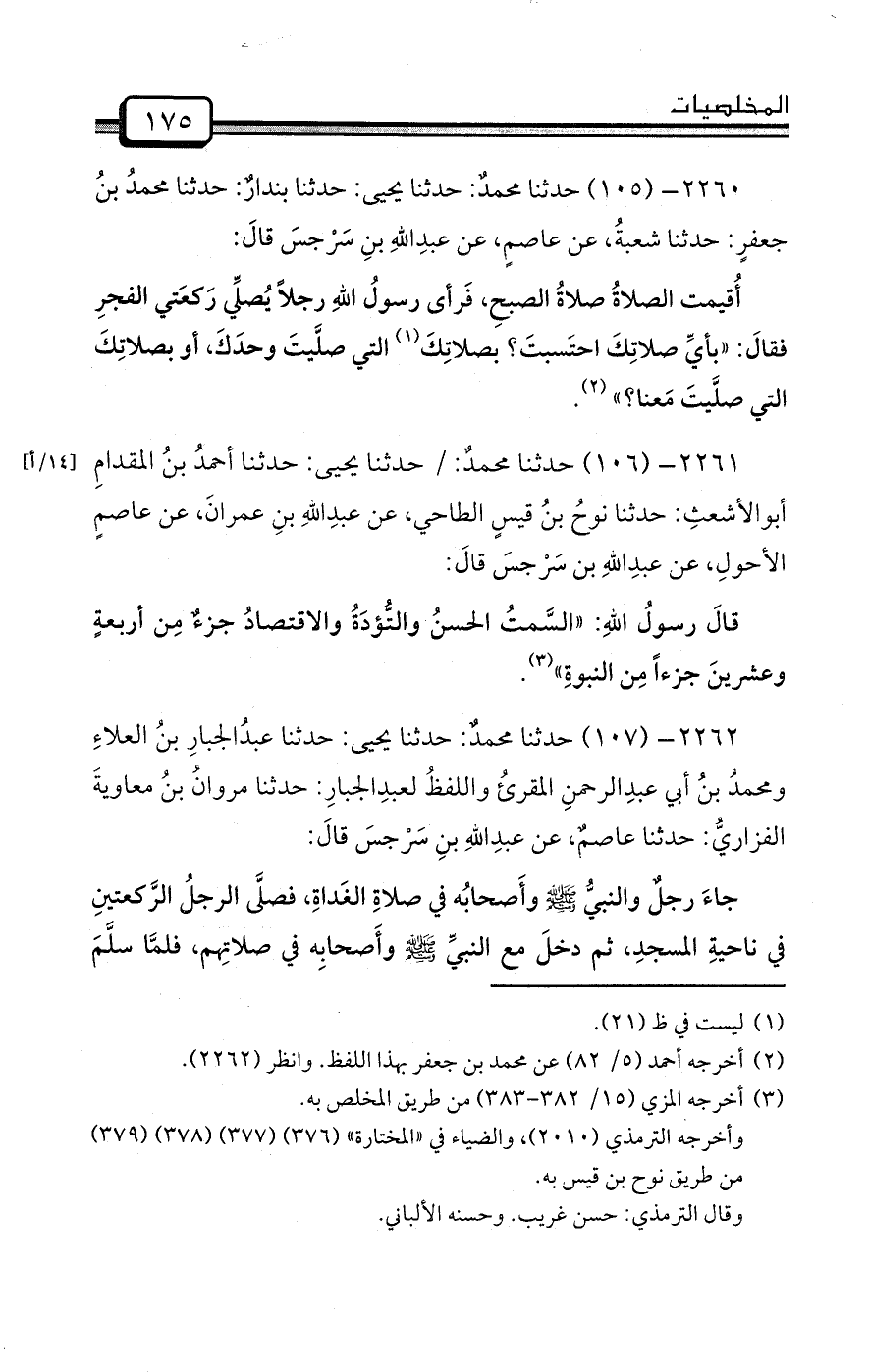 2262- (107) حدثنا محمدٌ: حدثنا يحيى: حدثنا عبدُالجبارِ بنُ العلاءِ ومحمدُ بنُ أبي عبدِالرحمنِ المقرئُ واللفظُ لعبدِالجبارِ: حدثنا مروانُ بنُ معاويةَ الفزاريُّ: حدثنا عاصمٌ، عن عبدِاللهِ بنِ سَرْجسَ قالَ:
