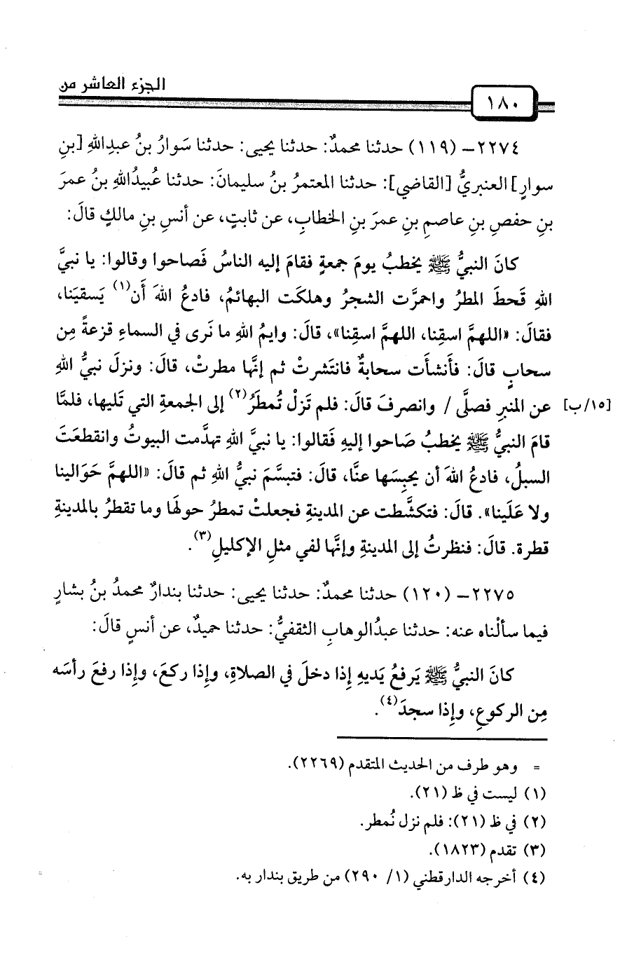 2274- (119) حدثنا محمدٌ: حدثنا يحيى: حدثنا سَوارُ بنُ عبدِاللهِ [بنِ سوارٍ] العنبريُّ [القاضي] : حدثنا المعتمرُ بنُ سليمانَ: حدثنا عُبيدُاللهِ بنُ عمرَ بنِ حفصِ بنِ عاصمِ بنِ عمرَ بنِ الخطابِ، عن ثابتٍ، عن أنسِ بنِ مالكٍ قالَ: