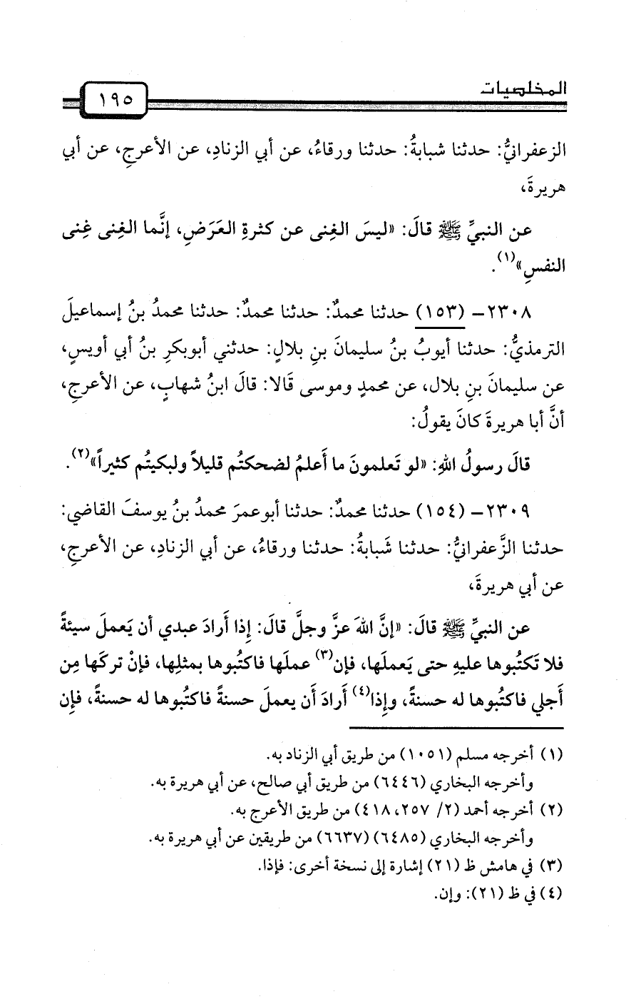 2309- (154) حدثنا محمدٌ: حدثنا أبوعمرَ محمدُ بنُ يوسفَ القاضي: حدثنا الزَّعفرانيُّ: حدثنا شَبابةُ: حدثنا ورقاءُ، عن أبي الزنادِ، عن الأعرجِ، عن أبي هريرةَ،