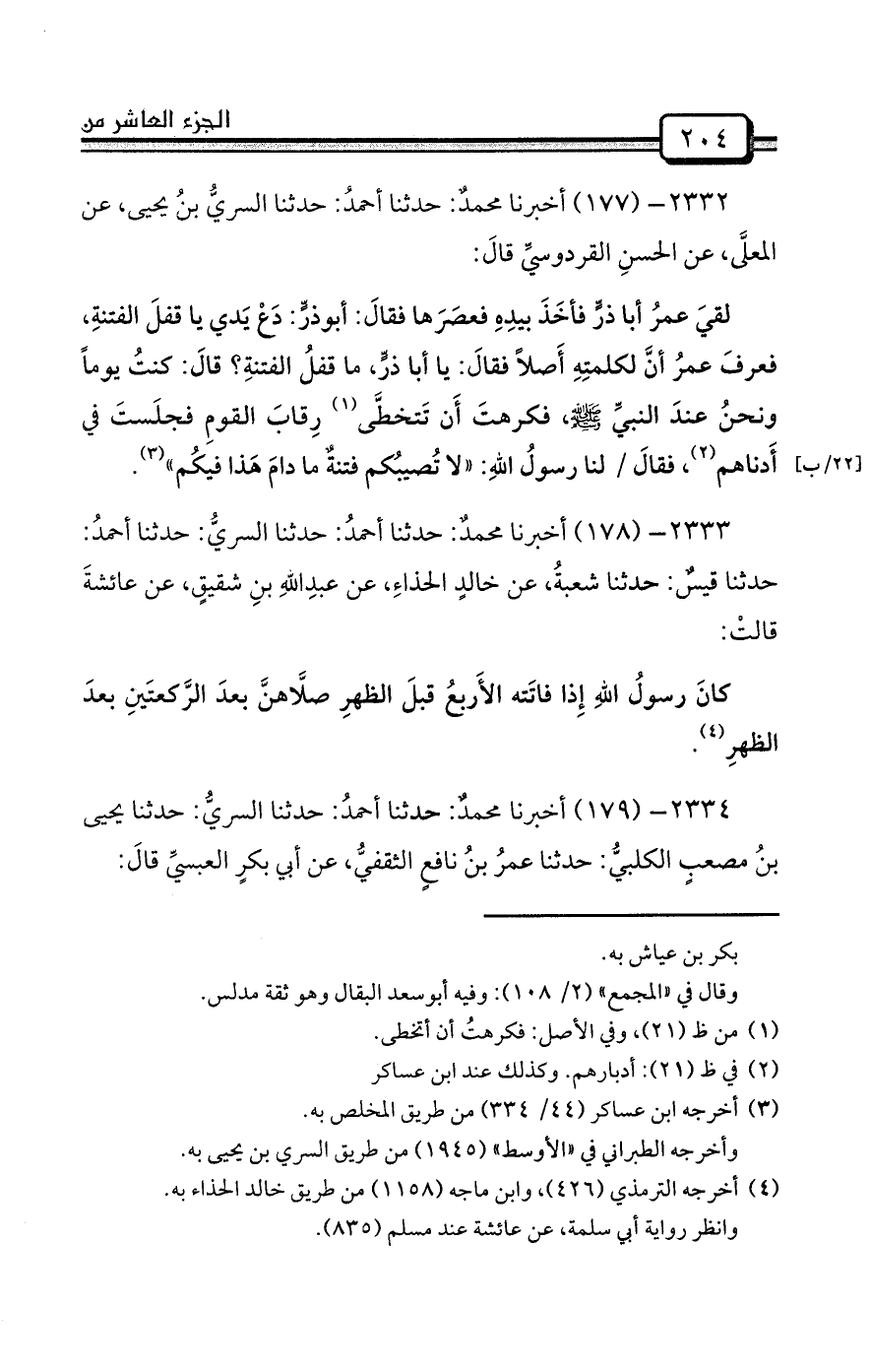 2334- (179) أخبرنا محمدٌ: حدثنا أحمدُ: حدثنا السريُّ: حدثنا يحيى بنُ مصعبٍ الكلبيُّ: حدثنا عمرُ بنُ نافعٍ الثقفيُّ، عن أبي بكرٍ العبسيِّ قالَ: