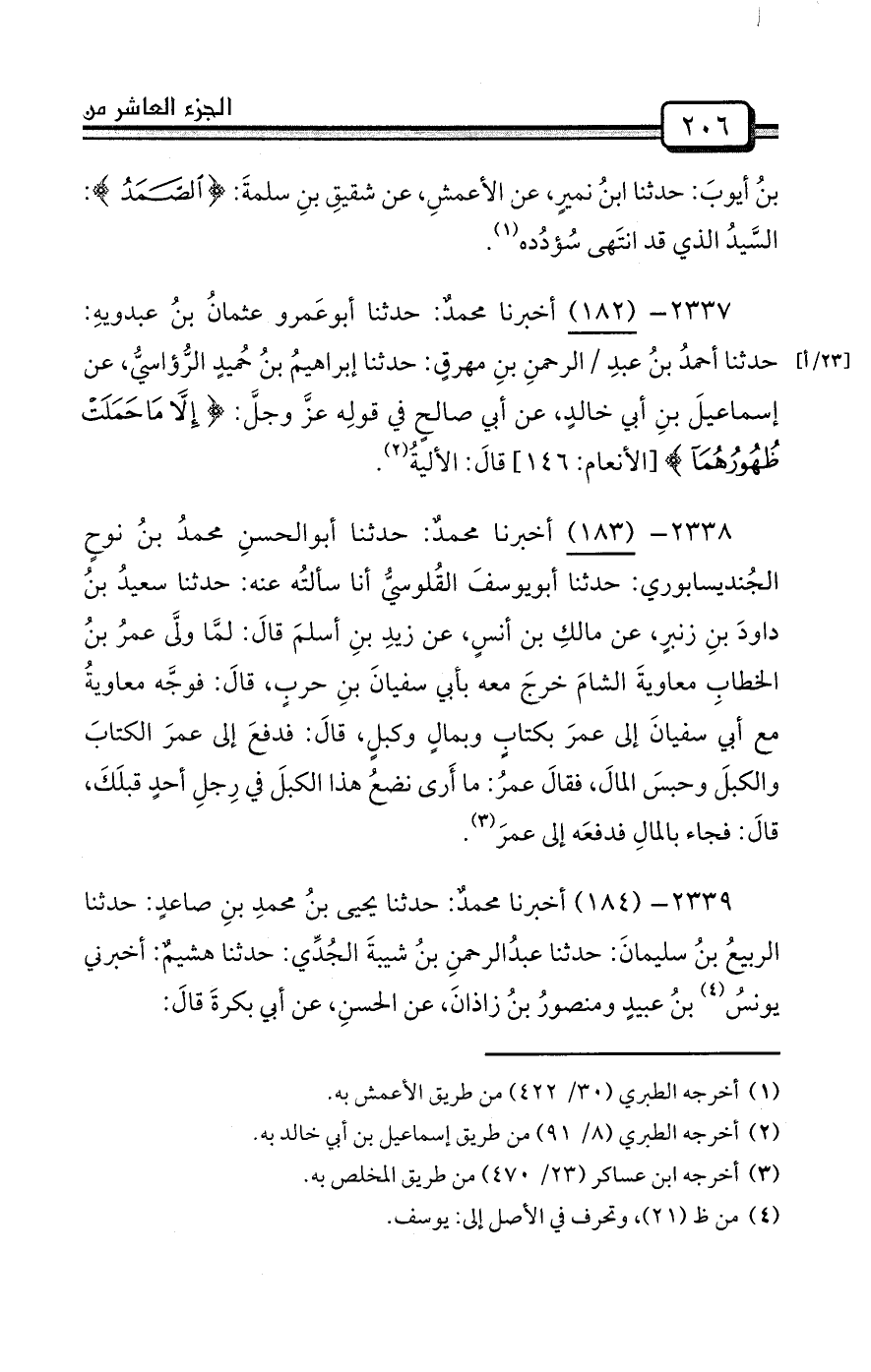 بنُ أيوبَ: حدثنا ابنُ نميرٍ، عن الأعمشِ، عن شقيقِ بنِ سلمةَ: {الصَّمَد} : السَّيدُ الذي قد انتَهى سُؤدُده (¬1) .