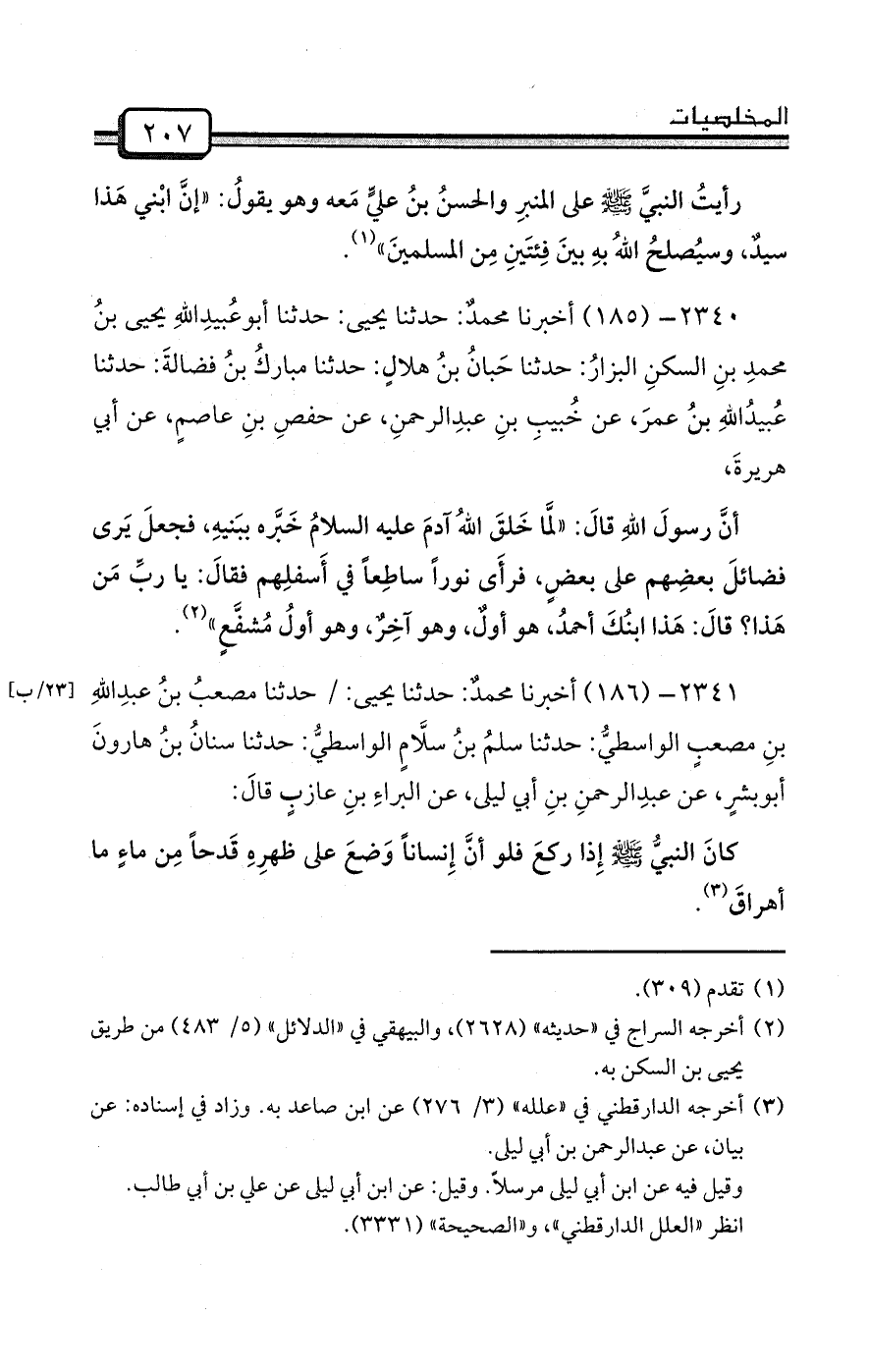2341- (186) أخبرنا محمدٌ: حدثنا يحيى: / حدثنا مصعبُ بنُ عبدِاللهِ بنِ مصعبٍ الواسطيُّ: حدثنا سلمُ بنُ سلَّامٍ الواسطيُّ: حدثنا سنانُ بنُ هارونَ أبوبشرٍ، عن عبدِالرحمنِ بنِ أبي ليلى، عن البراءِ بنِ عازبٍ قالَ: