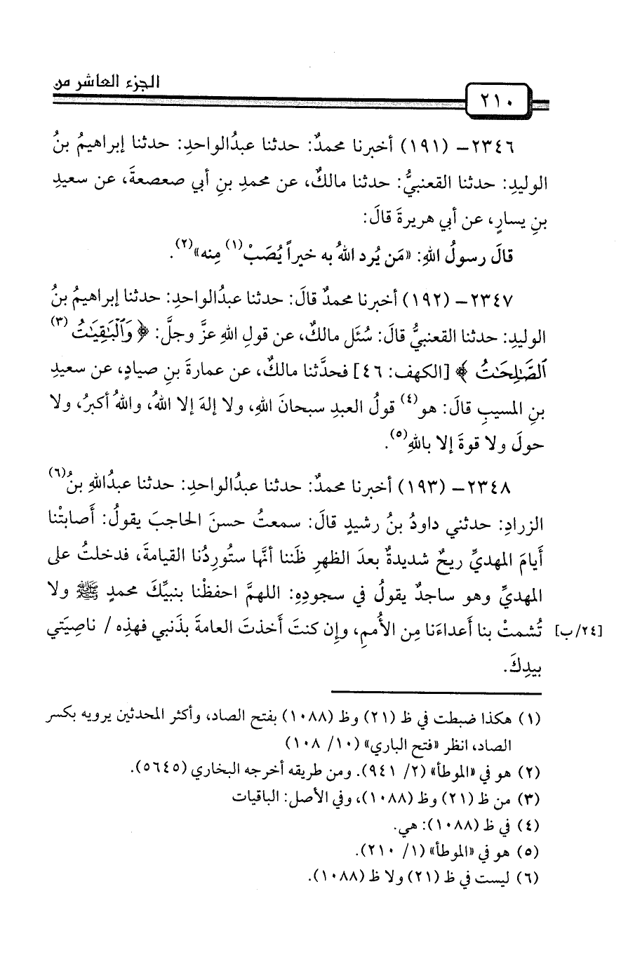 2347- (192) أخبرنا محمدٌ قالَ: حدثنا عبدُالواحدِ: حدثنا إبراهيمُ بنُ الوليدِ: حدثنا القعنبيُّ قالَ: سُئَل مالكٌ، عن قولِ اللهِ عزَّ وجلَّ: {وَالْبَاقِيَاتُ الصَّالِحَاتُ} [الكهف: 46] فحدَّثنا مالكٌ، عن عمارةَ بنِ صيادٍ، عن سعيدِ بنِ المسيبِ قالَ: هو (¬4) قولُ العبدِ سبحانَ اللهِ، ولا إلهَ إلا اللهُ، واللهُ أكبرُ، ولا حولَ ولا قوةَ إلا باللهِ (¬5) .