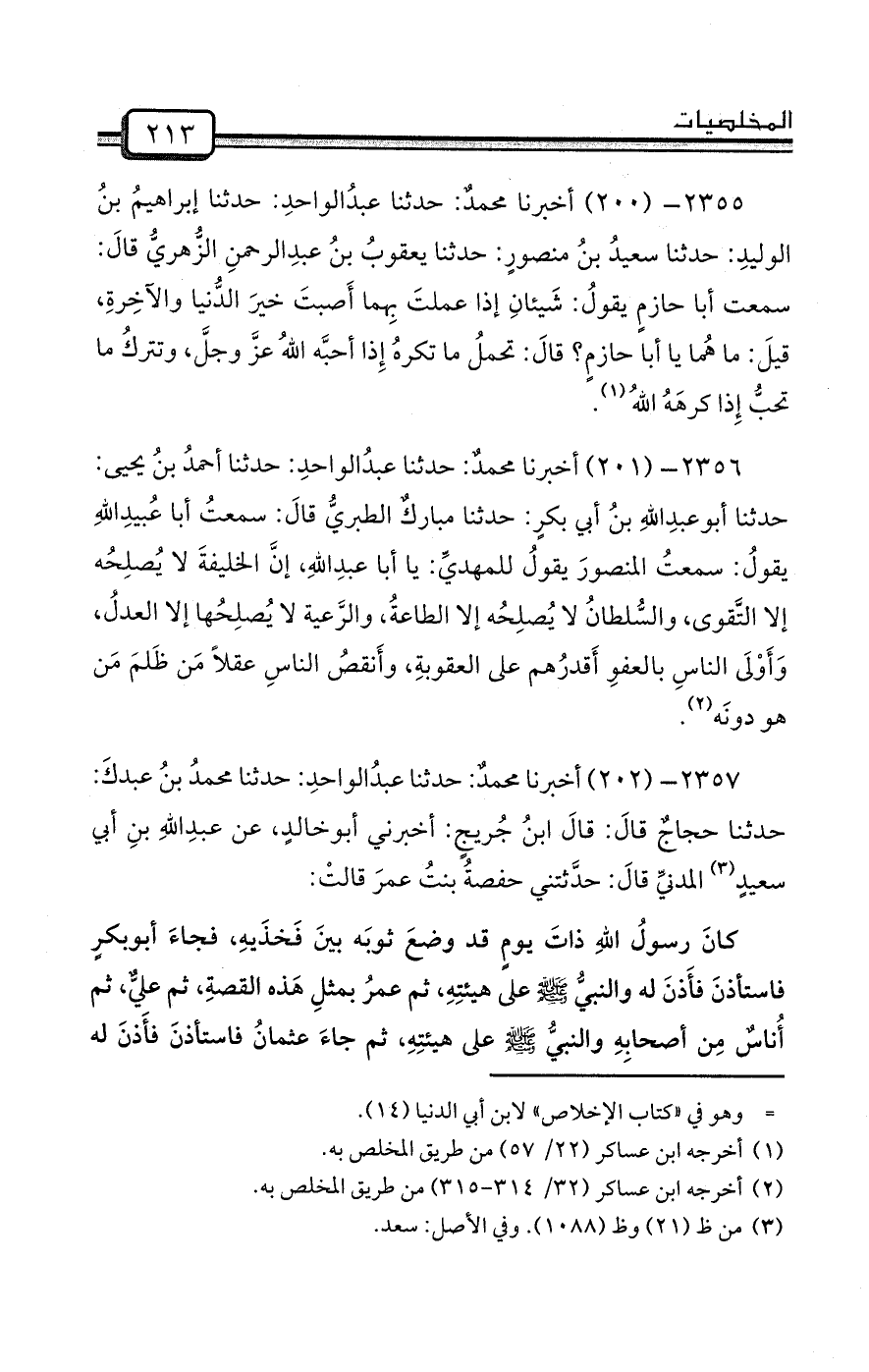 2355- (200) أخبرنا محمدٌ: حدثنا عبدُالواحدِ: حدثنا إبراهيمُ بنُ الوليدِ: حدثنا سعيدُ بنُ منصورٍ: حدثنا يعقوبُ بنُ عبدِالرحمنِ الزُّهريُّ قالَ: سمعت أبا حازمٍ يقولُ: شَيئانِ إذا عملتَ بِهما أَصبتَ خيرَ الدُّنيا والآخِرةِ، قيلَ: ما هُما يا أبا حازمٍ؟ قالَ: تحملُ ما تكرهُ إِذا أحبَّه اللهُ عزَّ وجلَّ، وتتركُ ما تحبُّ إِذا كرهَهُ اللهُ (¬1) .