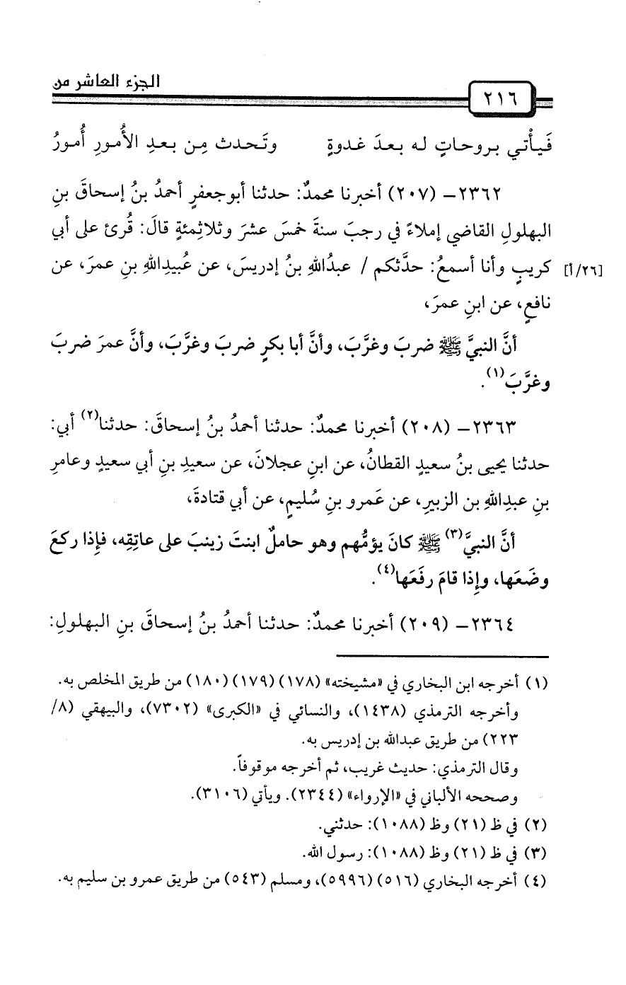 2362- (207) أخبرنا محمدٌ: حدثنا أبوجعفرٍ أحمدُ بنُ إسحاقَ بنِ البهلولِ القاضي إملاءً في رجبَ سنةَ خمسَ عشرَ وثلاثِمئةٍ قالَ: قُرئ على أبي كريبٍ وأنا أسمعُ: حدَّثكم / عبدُاللهِ بنُ إدريسَ، عن عُبيدِاللهِ بنِ عمرَ، عن نافعٍ، عن ابنِ عمرَ،