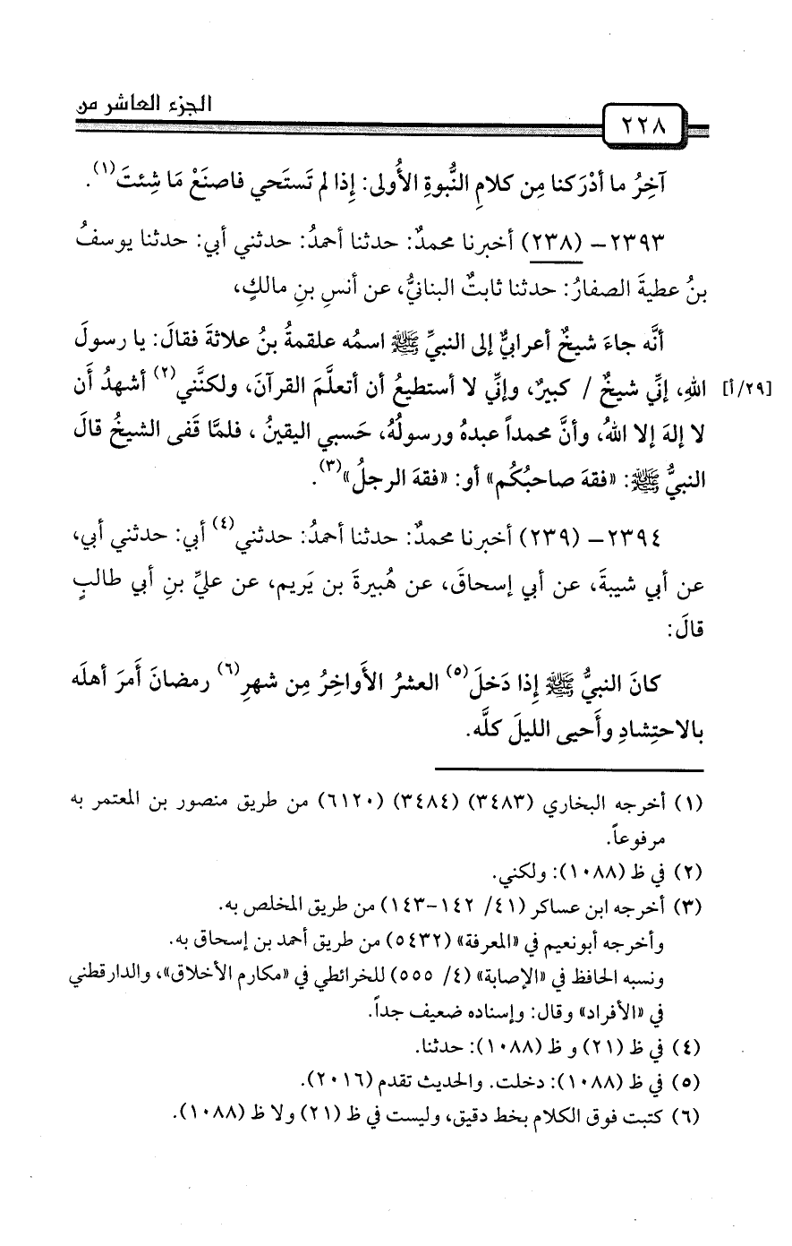 2394- (239) أخبرنا محمدٌ: حدثنا أحمدُ: حدثني (¬4) أبي: حدثني أبي، عن أبي شيبةَ، عن أبي إسحاقَ، عن هُبيرةَ بن يَريم، عن عليِّ بنِ أبي طالبٍ قالَ: