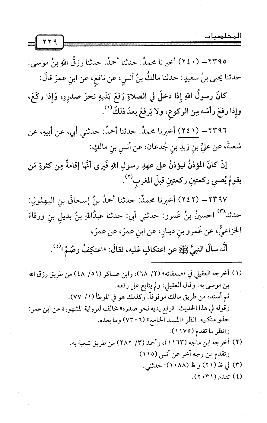 2395- (240) أخبرنا محمدٌ: حدثنا أحمدُ: حدثنا رزقُ اللهِ بنُ موسى: حدثنا يحيى بنُ سعيدٍ: حدثنا مالكُ بنُ أنسٍ، عن نافعٍ، عن ابنِ عمرَ قالَ: