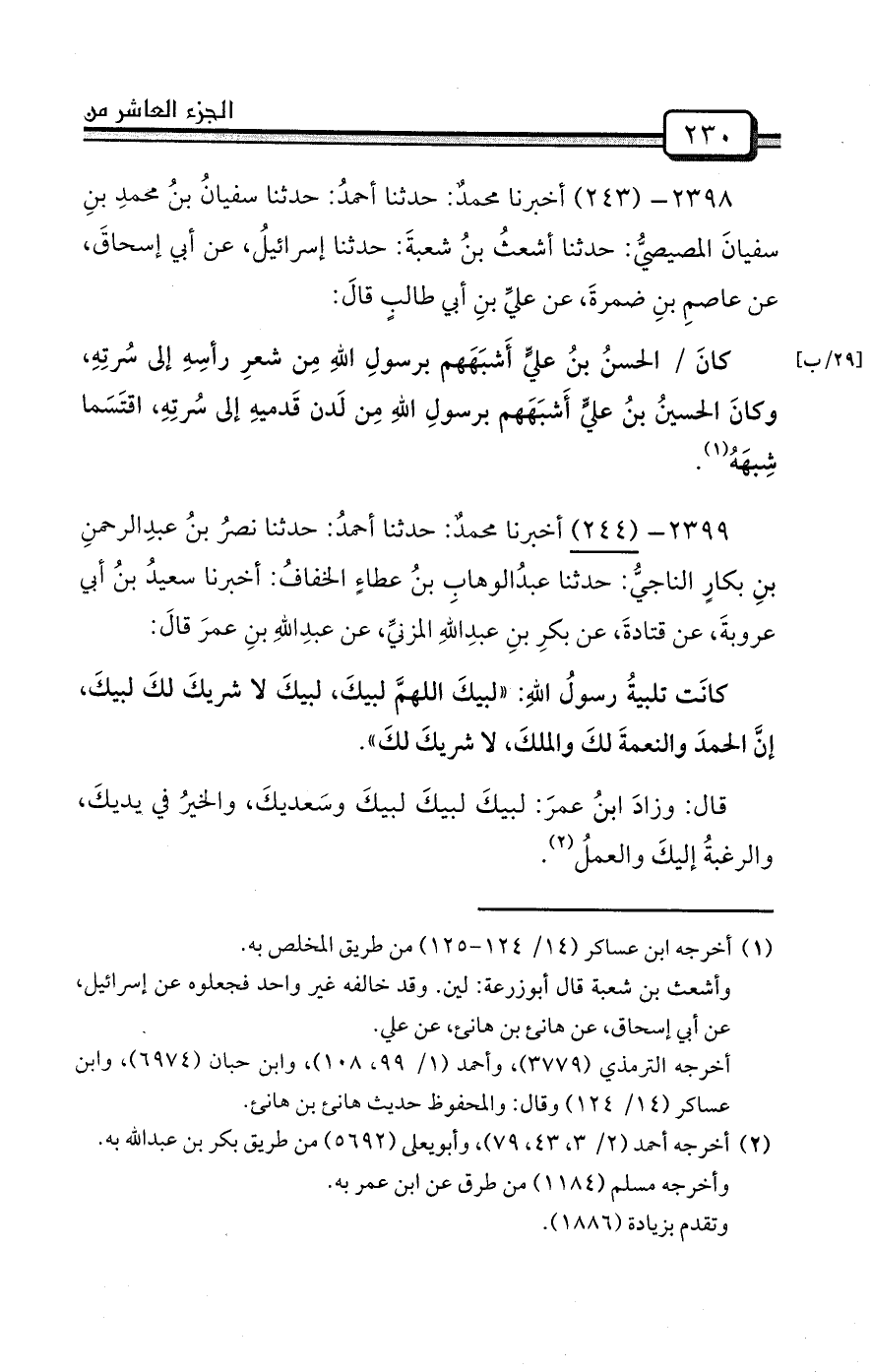 2398- (243) أخبرنا محمدٌ: حدثنا أحمدُ: حدثنا سفيانُ بنُ محمدِ بنِ سفيانَ المصيصيُّ: حدثنا أشعثُ بنُ شعبةَ: حدثنا إسرائيلُ، عن أبي إسحاقَ، عن عاصمِ بنِ ضمرةَ، عن عليِّ بنِ أبي طالبٍ قالَ: