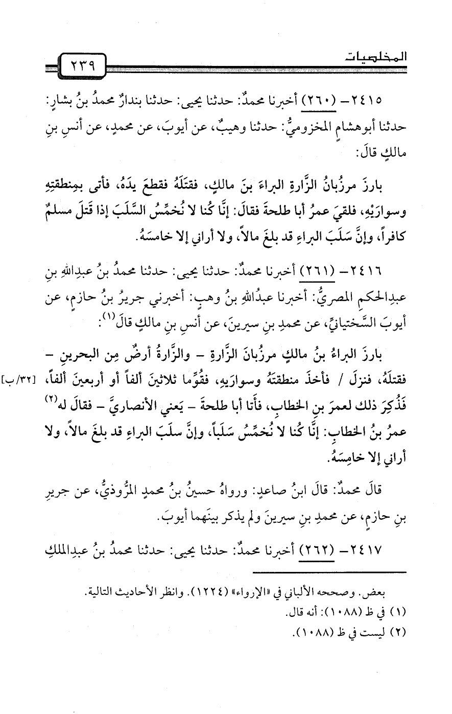 بارزَ البراءُ بنُ مالكٍ مرزُبانَ الزَّارةِ - والزَّارةُ أرضٌ مِن البحرينِ - فقتلَهُ، فنزلَ / فأخذَ منطقتَهُ وسوارَيهِ، فقُوِّما ثلاثينَ ألفاً أو أربعينَ ألفاً، فَذُكِرَ ذلك لعمرَ بنِ الخطابِ، فأَتا أبا طلحةَ - يَعني الأنصاريَّ - فقالَ له (¬2) عمرُ بنُ الخطابِ: إنَّا كُنا لا نُخمِّسُ سَلَباً، وإنَّ سلَبَ البراءِ قد بلغَ مالاً، ولا أراني إلا خامِسَهُ.
