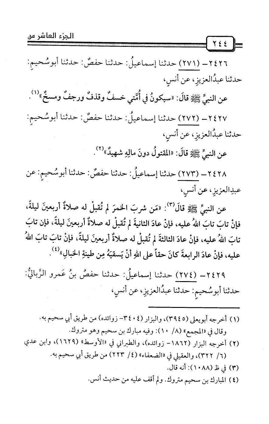 2426- (271) حدثنا إسماعيلُ: حدثنا حفصٌ: حدثنا أبوسُحيمٍ: حدثنا عبدُالعزيزِ، عن أنسٍ،