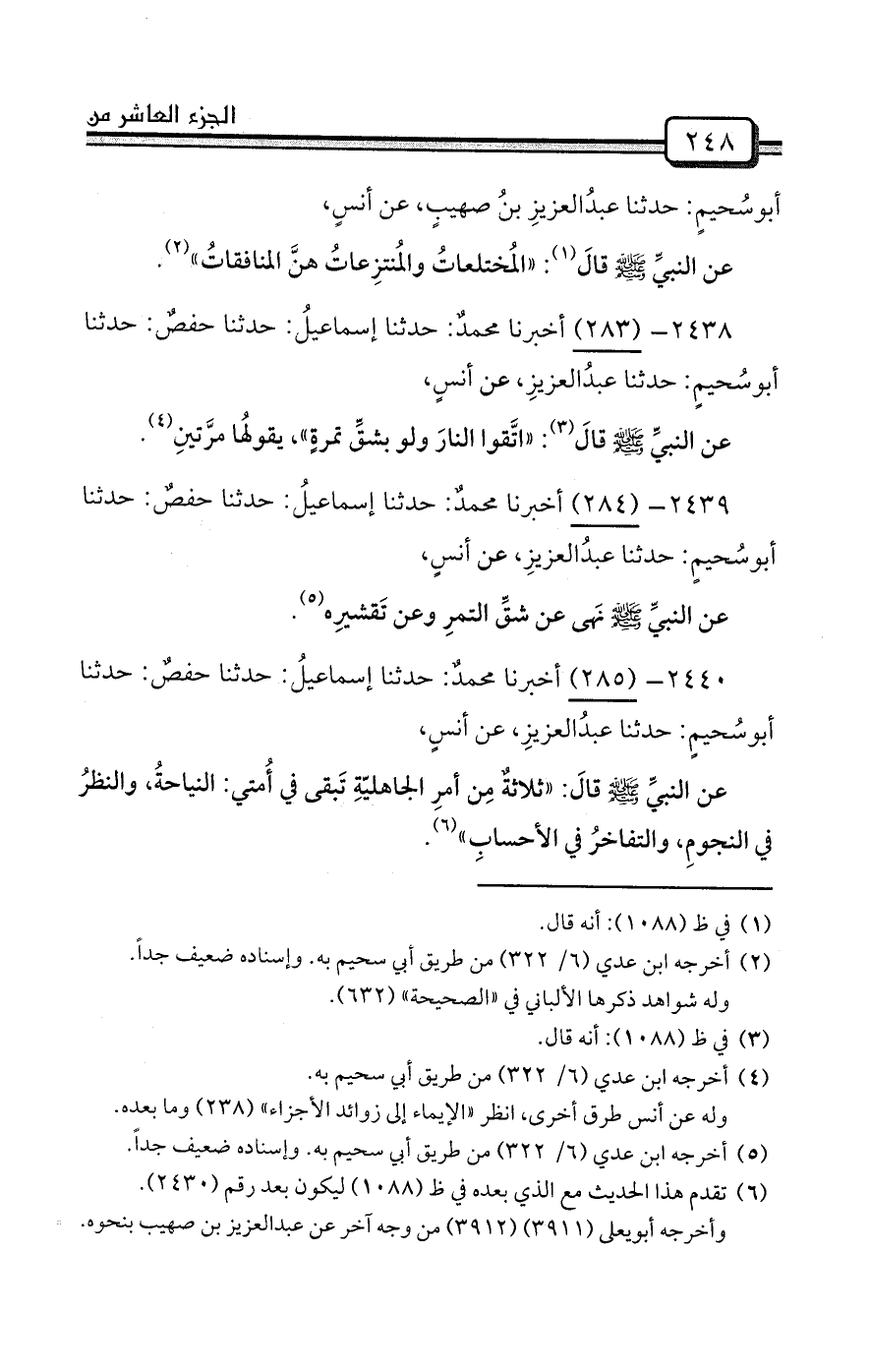 2440- (285) أخبرنا محمدٌ: حدثنا إسماعيلُ: حدثنا حفصٌ: حدثنا أبوسُحيمٍ: حدثنا عبدُالعزيزِ، عن أنسٍ،