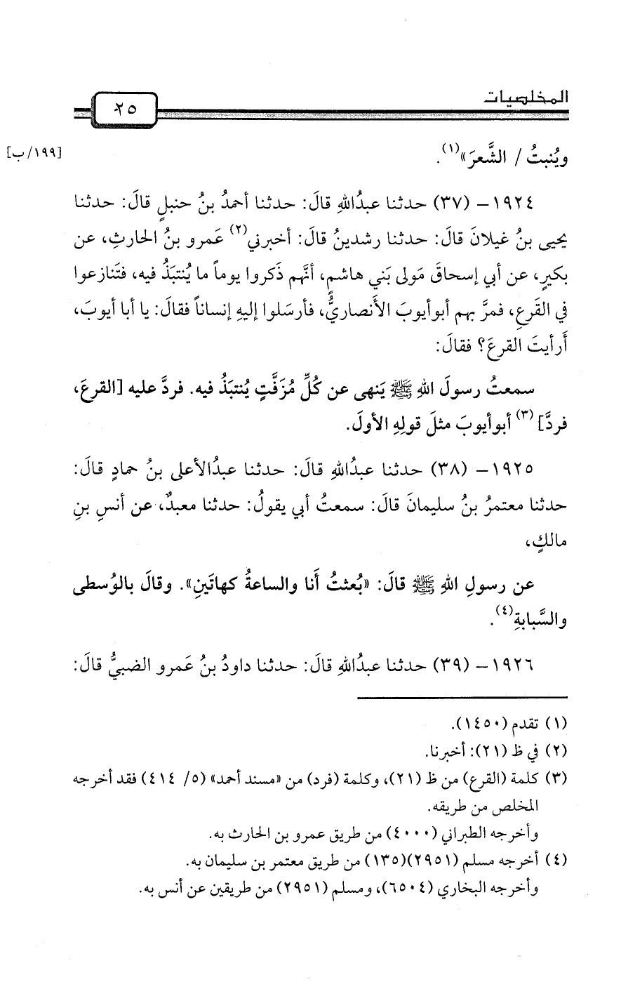 1925- (38) حدثنا عبدُاللهِ قالَ: حدثنا عبدُالأعلى بنُ حمادٍ قالَ: حدثنا معتمرُ بنُ سليمانَ قالَ: سمعتُ أبي يقولُ: حدثنا معبدٌ، عن أنسِ بنِ مالكٍ،
