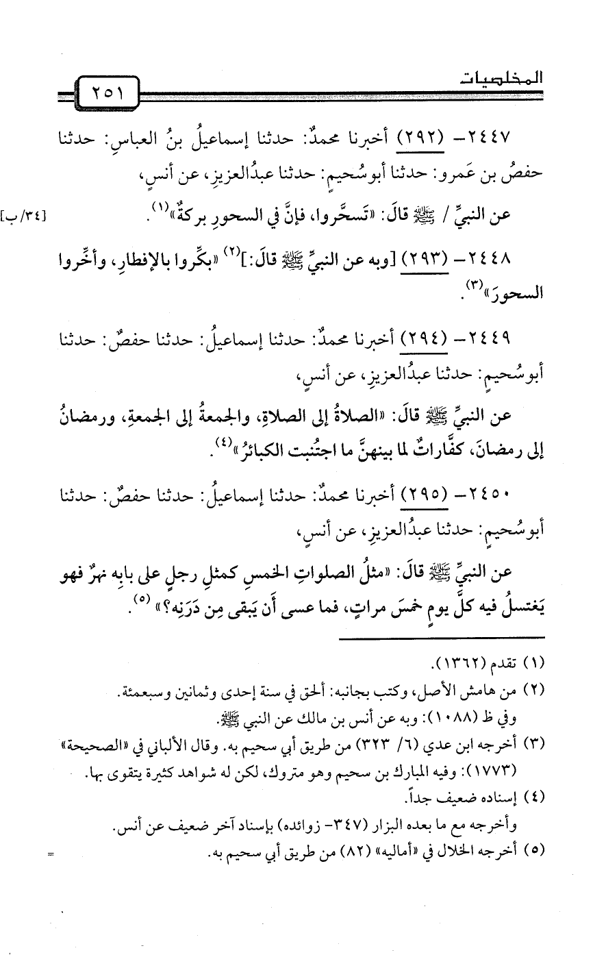 2450- (295) أخبرنا محمدٌ: حدثنا إسماعيلُ: حدثنا حفصٌ: حدثنا أبوسُحيمٍ: حدثنا عبدُالعزيزِ، عن أنسٍ،