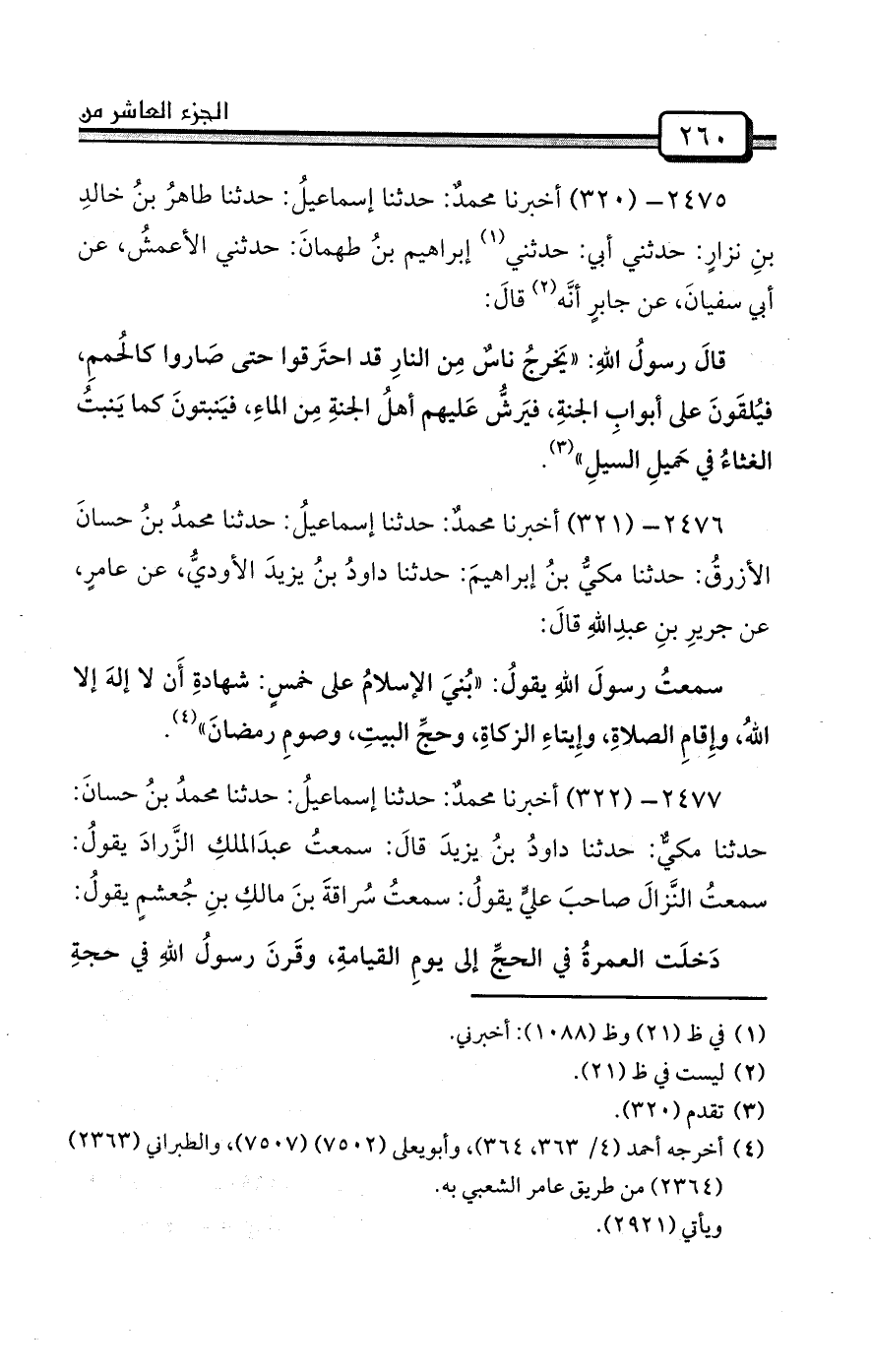 2475- (320) أخبرنا محمدٌ: حدثنا إسماعيلُ: حدثنا طاهرُ بنُ خالدِ بنِ نزارٍ: حدثني أبي: حدثني (¬1) إبراهيم بنُ طهمانَ: حدثني الأعمشُ، عن أبي سفيانَ، عن جابرٍ أنَّه (¬2) قالَ: