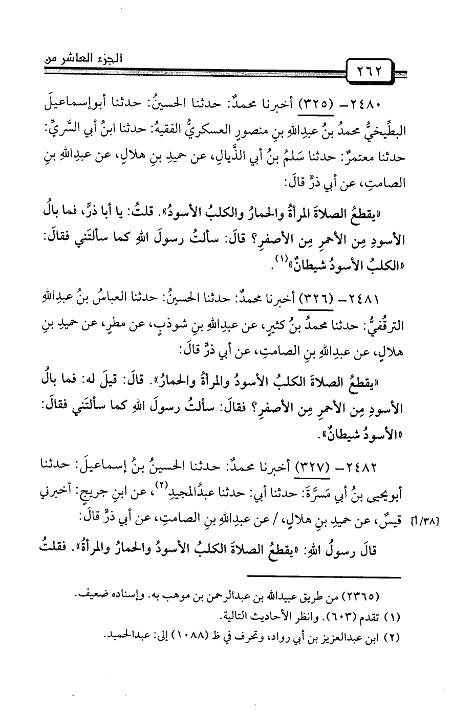 2480- (325) أخبرنا محمدٌ: حدثنا الحسينُ: حدثنا أبوإسماعيلَ البطِّيخيُّ محمدُ بنُ عبدِاللهِ بنِ منصورٍ العسكريُّ الفقيهُ: حدثنا ابنُ أبي السَّريِّ: حدثنا معتمرٌ: حدثنا سَلمُ بنُ أبي الذَّيالِ، عن حميدِ بنِ هلالٍ، عن عبدِاللهِ بنِ الصامتِ، عن أبي ذرٍّ قالَ: