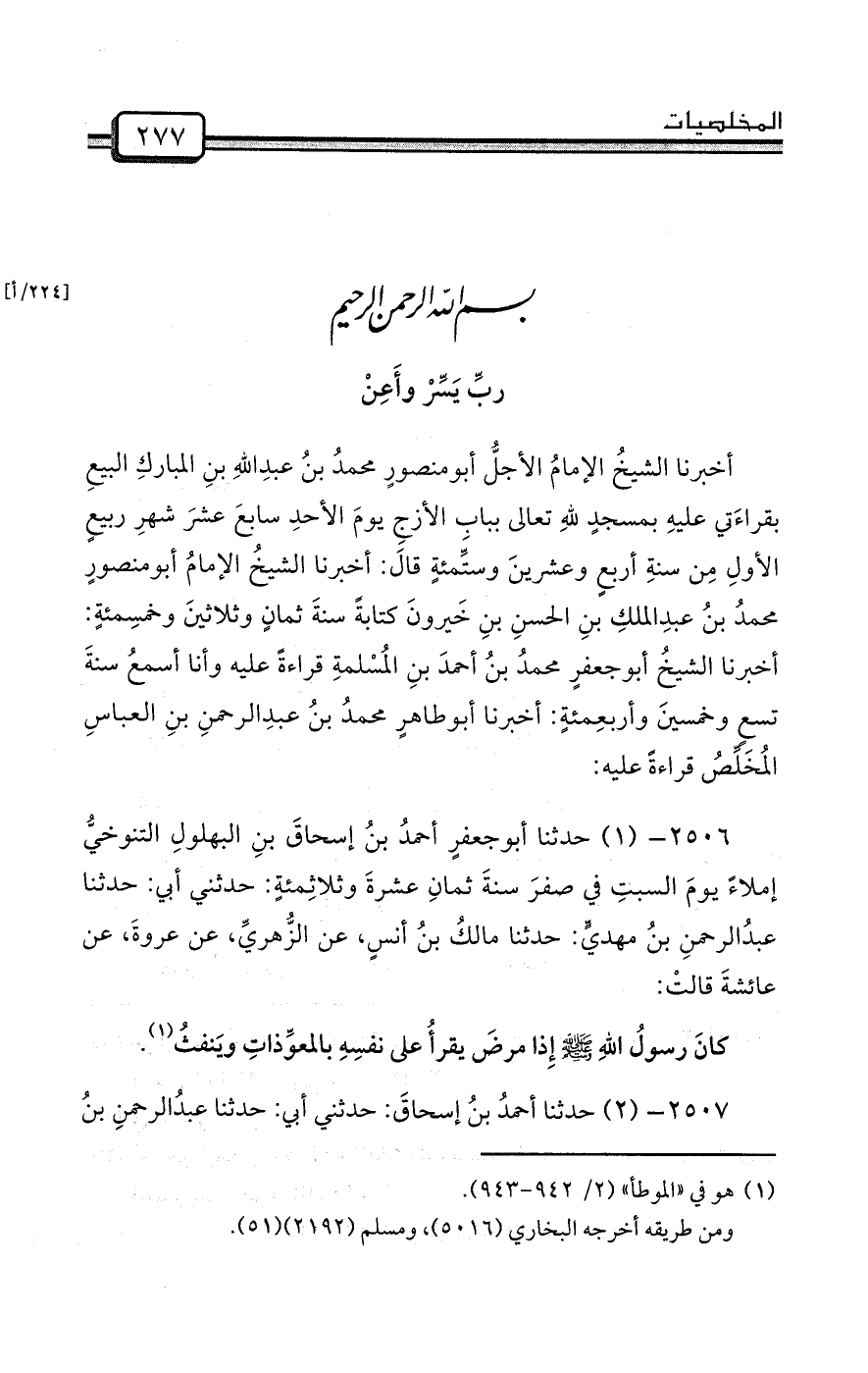 أخبرنا الشيخُ الإمامُ الأجلُّ أبومنصورٍ محمدُ بنُ عبدِاللهِ بنِ المباركِ البيعِ بقراءَتي عليهِ بمسجدٍ للهِ تعالى ببابِ الأزجِ يومَ الأحدِ سابعَ عشرَ شهرِ ربيعٍ الأولِ مِن سنةِ أربعٍ وعشرينَ وستِّمئةٍ قالَ: أخبرنا الشيخُ الإمامُ أبومنصورٍ محمدُ بنُ عبدِالملكِ بنِ الحسنِ بنِ خَيرونَ كتابةً سنةَ ثمانٍ وثلاثينَ وخمسِمئةٍ: أخبرنا الشيخُ أبوجعفرٍ محمدُ بنُ أحمدَ بنِ المُسْلمةِ قراءةً عليه وأنا أسمعُ سنةَ تسعٍ وخمسينَ وأربعِمئةٍ: أخبرنا أبوطاهرٍ محمدُ بنُ عبدِالرحمنِ بنِ العباسِ المُخَلِّصُ قراءةً عليه: