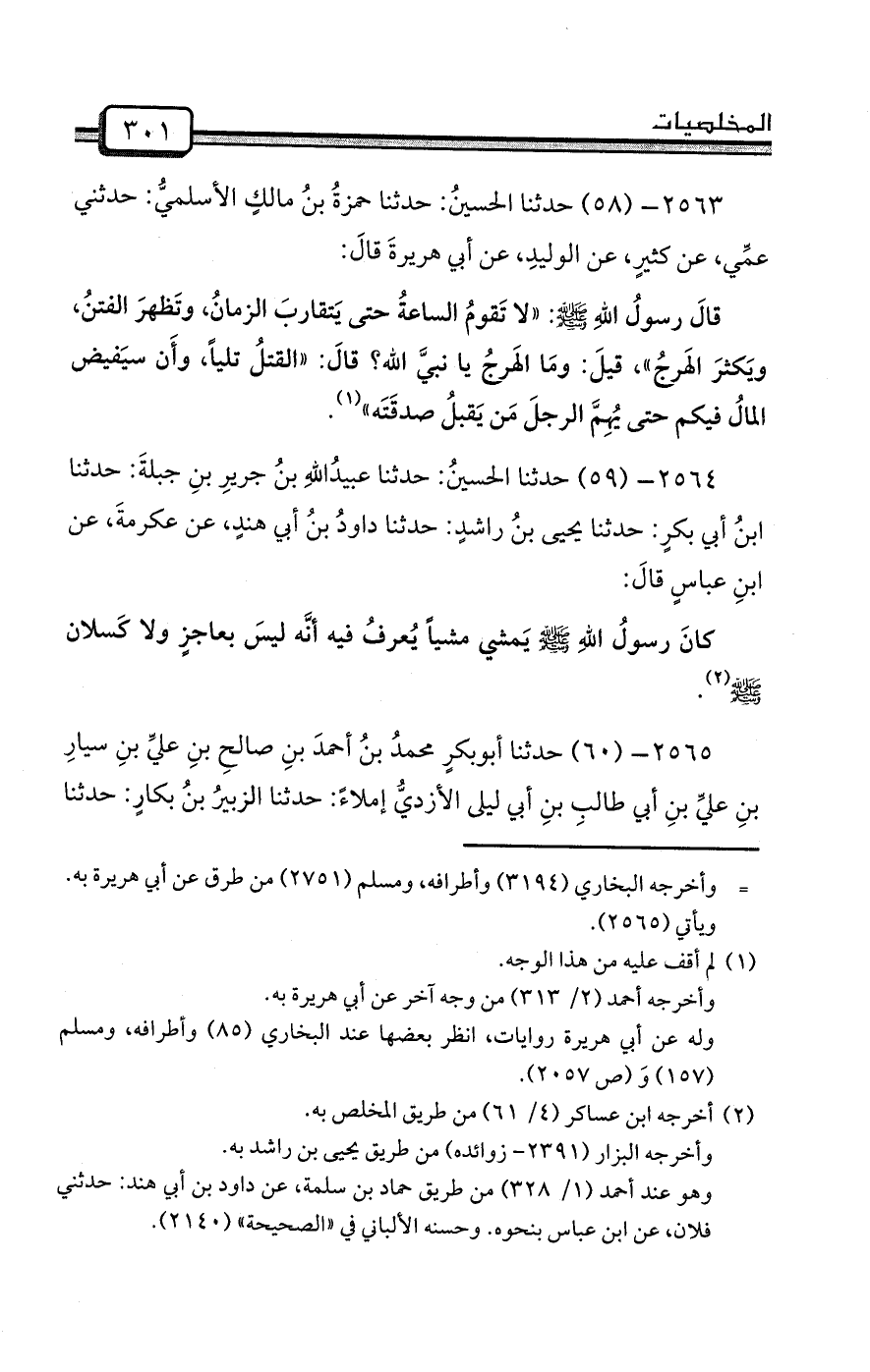 2563- (58) حدثنا الحسينُ: حدثنا حمزةُ بنُ مالكٍ الأسلميُّ: حدثني عمِّي، عن كثيرٍ، عن الوليدِ، عن أبي هريرةَ قالَ: