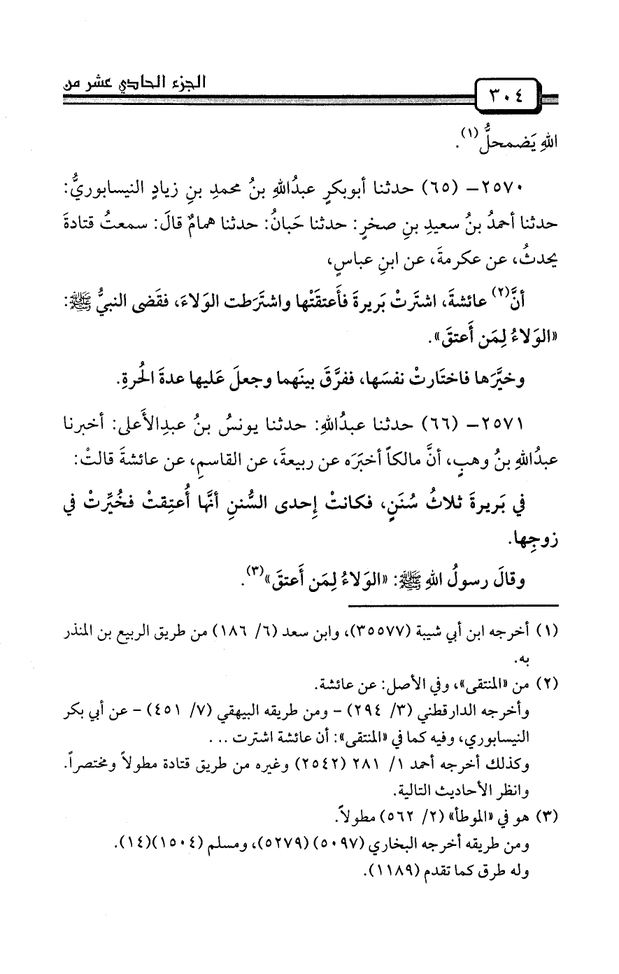 وأخرجه الدارقطني (3/ 294) - ومن طريقه البيهقي (7/ 451) - عن أبي بكر النيسابوري، وفيه كما في «المنتقى» : أن عائشة اشترت ...