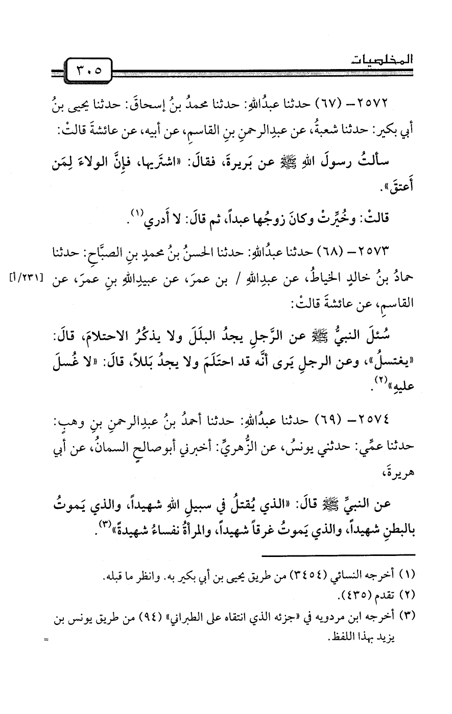 2573- (68) حدثنا عبدُاللهِ: حدثنا الحسنُ بنُ محمدٍ بنِ الصبَّاحِ: حدثنا حمادُ بنُ خالدٍ الخياطُ، عن عبدِاللهِ / بن عمرَ، عن عبيدِاللهِ بنِ عمرَ، عن القاسمِ، عن عائشةَ قالتْ: