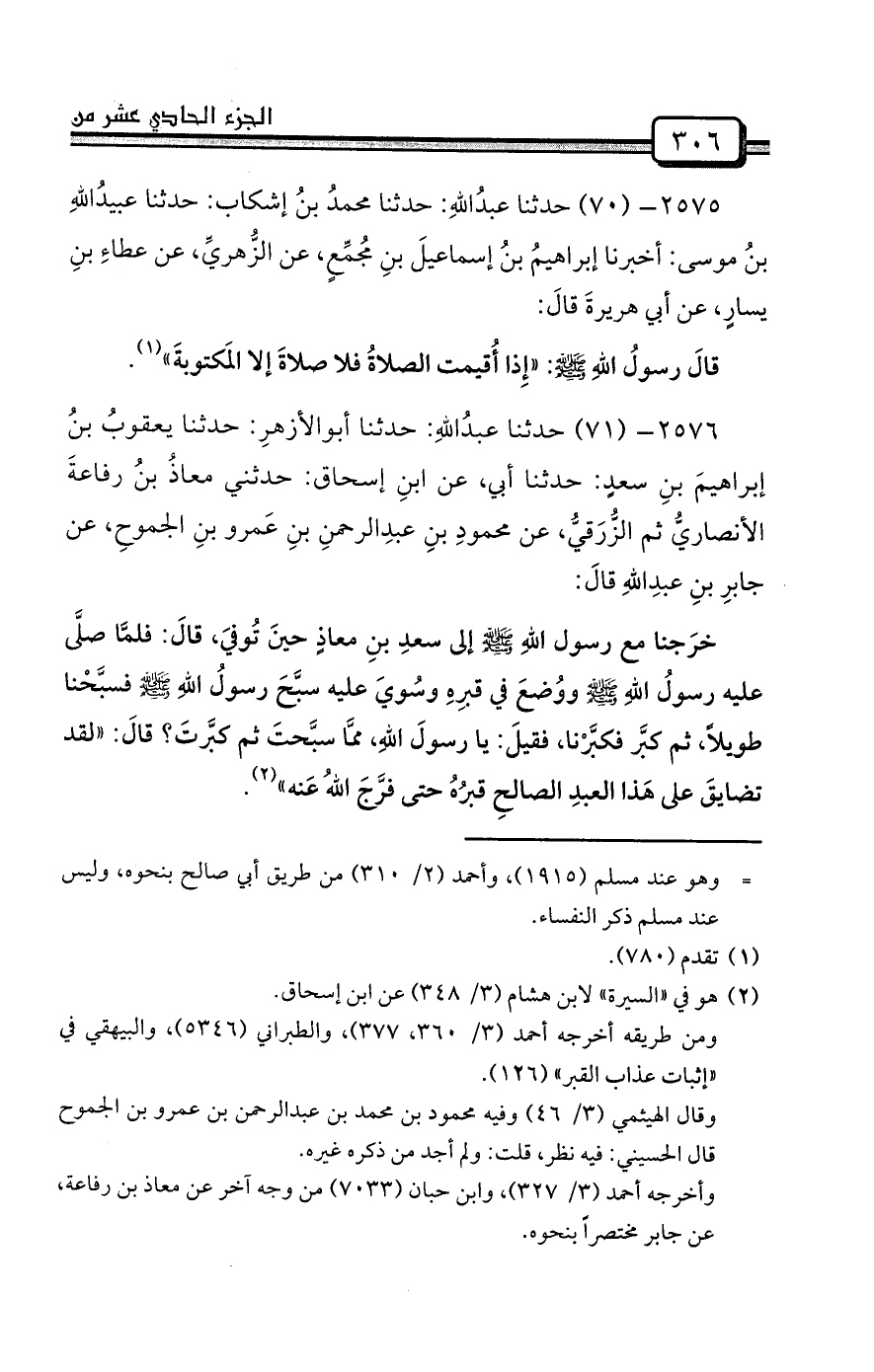2576- (71) حدثنا عبدُاللهِ: حدثنا أبوالأزهرِ: حدثنا يعقوبُ بنُ إبراهيمَ بنِ سعدٍ: حدثنا أبي، عن ابنِ إسحاق: حدثني معاذُ بنُ رفاعةَ الأنصاريُّ ثم الزُّرَقيُّ، عن محمودِ بنِ عبدِالرحمنِ بنِ عَمرو بنِ الجموحِ، عن جابرِ بنِ عبدِاللهِ قالَ: