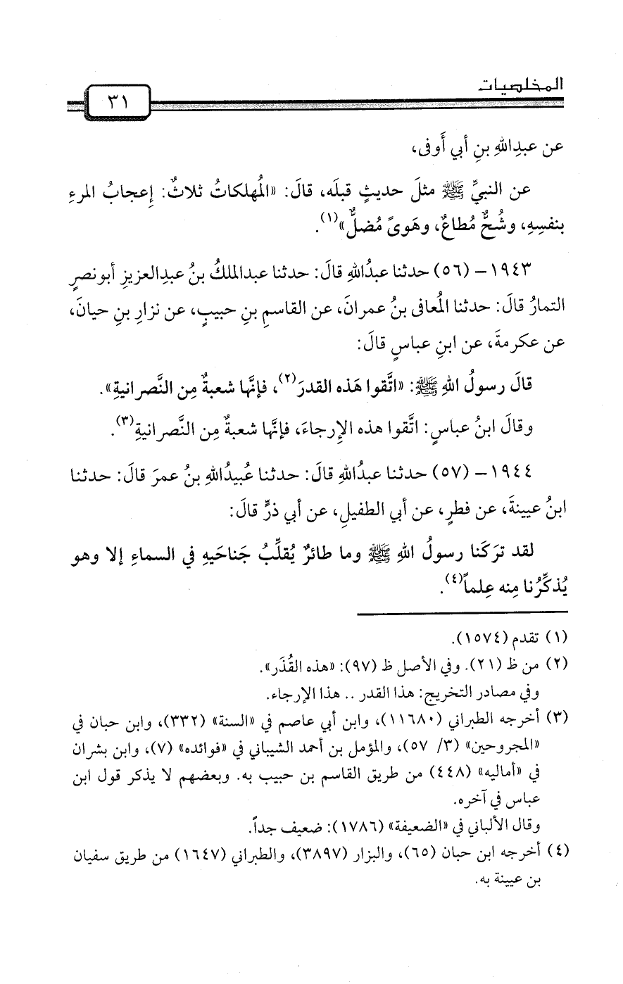 1944- (57) حدثنا عبدُاللهِ قالَ: حدثنا عُبيدُاللهِ بنُ عمرَ قالَ: حدثنا ابنُ عيينةَ، عن فطرٍ، عن أبي الطفيلِ، عن أبي ذرٍّ قالَ: